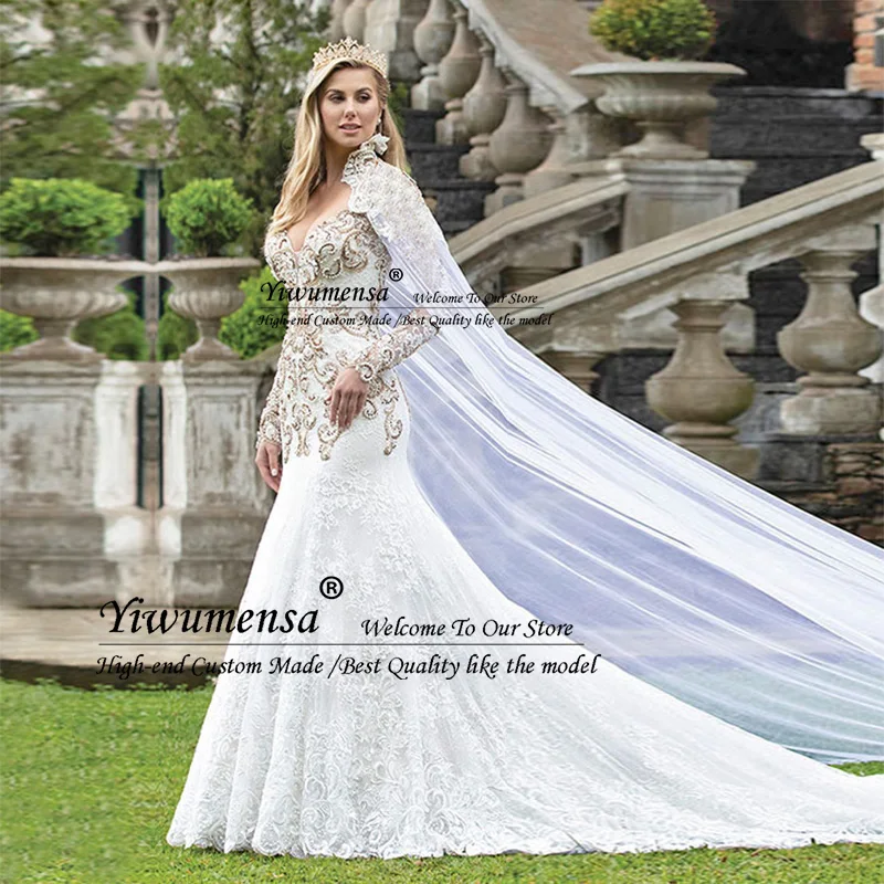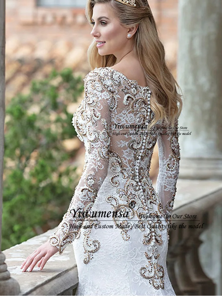 Роскошные свадебные платья-русалки, золотые бусины, стразы, свадебные платья, Элегантное свадебное платье с длинным рукавом, свадебные платья