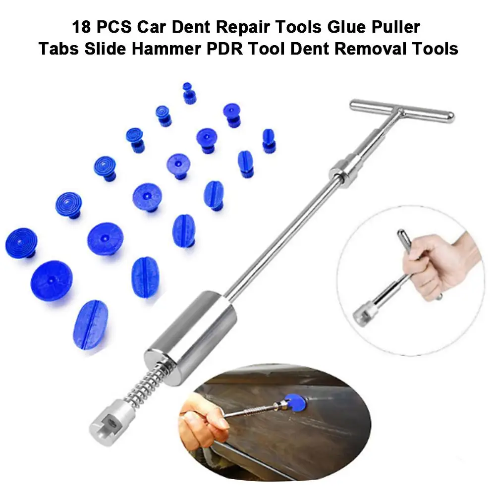 Инструмент для ремонта вмятин автомобиля, набор для снятия вмятин с Т-образным стержнем, съемник 2 в 1, скользящий молоток, обратный молоток, клеевые вкладки, присоска