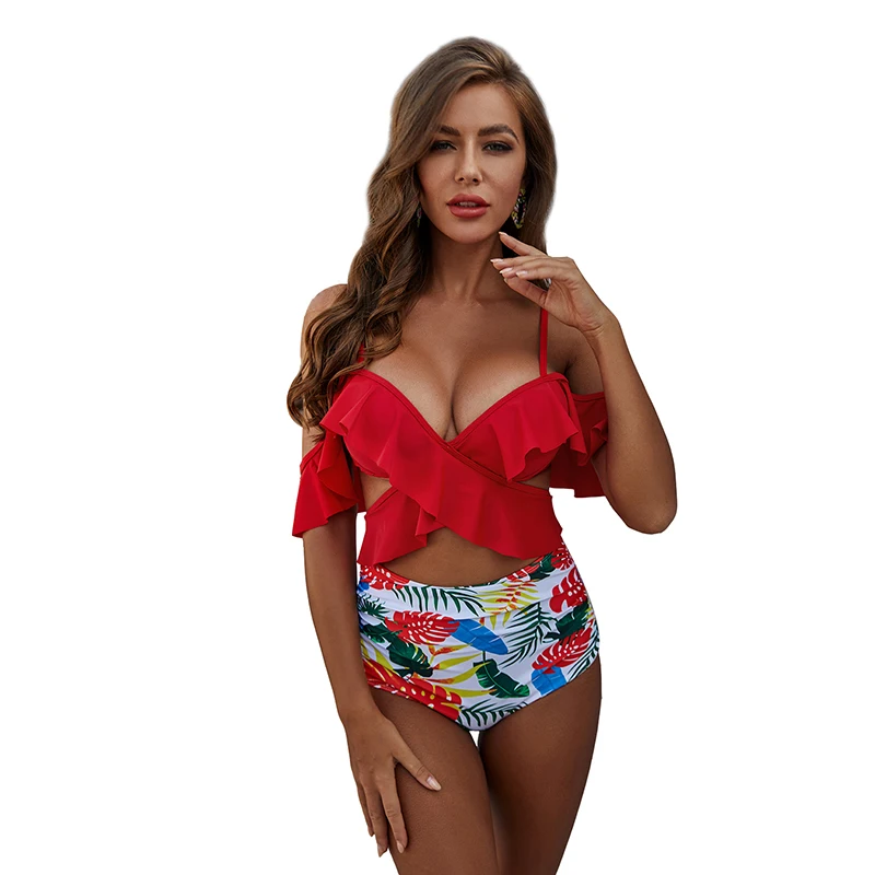 Женский купальник с оборками и открытыми плечами, однотонный топ + цветочные шорты, комплект бикини с высокой талией, пляжный купальный костюм, купальники, бикини для женщин