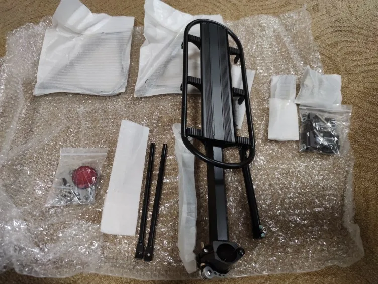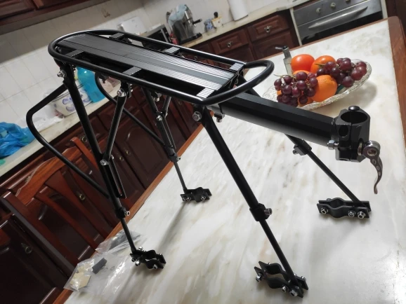 Багажная стойка быстро получена в течение 9 дней во Франции. Хорошее качество. Легкий, в основном изготовлен из алюминия, за исключением некоторых металлических стержней. Винты из нержавеющей стали, которые не ржавеют (они не любят). Краска немного хрупкая .. Быстрое крепление хорошо затягивается. Части пены отмечают краску, когда они плотные и измельченные, я заменил их толстыми резинками, которые были старой внутренней трубкой. Багажная почта хорошо подходит, потому что металлические стержни являются мобильными и поэтому могут быть затянуты в различных местах велосипеда. Багажная стойка крепится на электрический велосипед Fat Bike , Fiido M1 с 4-дюймовыми широкими шинами, и это нормально. Поэтому я очень доволен своей покупкой. Идеально.