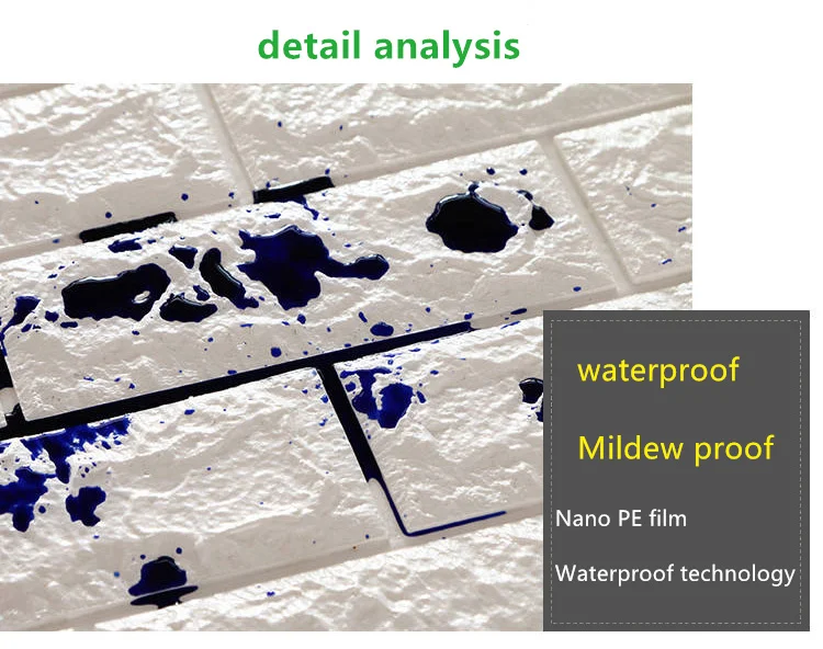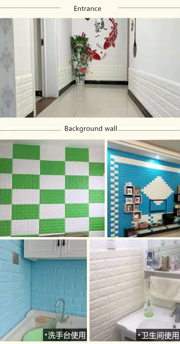 Продукция из ПЭ-это экологически чистые материалы, самоклеящиеся, водонепроницаемые, устойчивые к столкновениям, влагостойкие, теплоизоляционные, теплоизоляционные, легко моющиеся, безопасный дизайн, без запаха. Для сухого общего формирования цементной стены, стеклянных стен, деревянных стен, гладкой плитки, латексной краски стены. Конструкция простая, самоклеющаяся с собственным клеем, снять защитную пленку можно прикрепить непосредственно к стене, нулевые затраты на строительство. Изделия могут свободно резаться в соответствии с их размером, Поверхность является водонепроницаемой мембраной, скраб влажной тканью.