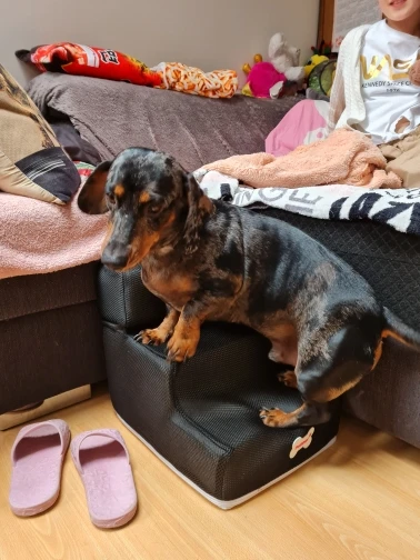 Лестница неплохая, но надо было заказывать 3 ступеньки, 2 низковаты. Мои собаки пока не умеют пользоваться этой лестницей