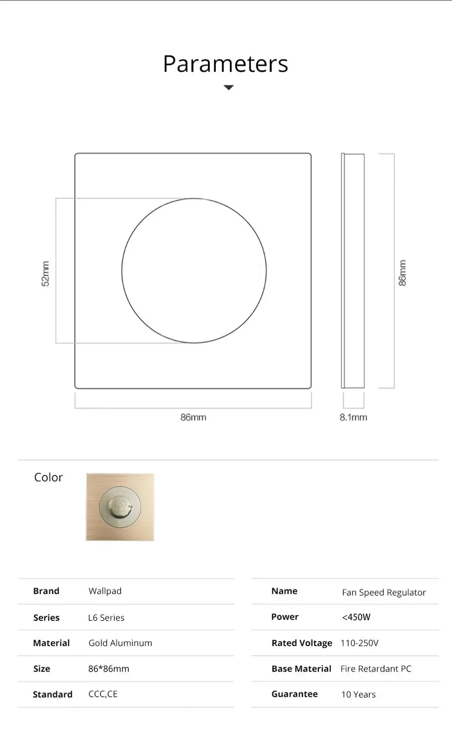 Wallpad Gold L6 регулятор скорости вентилятора настенный выключатель Матовая атласная Золотая алюминиевая пластина