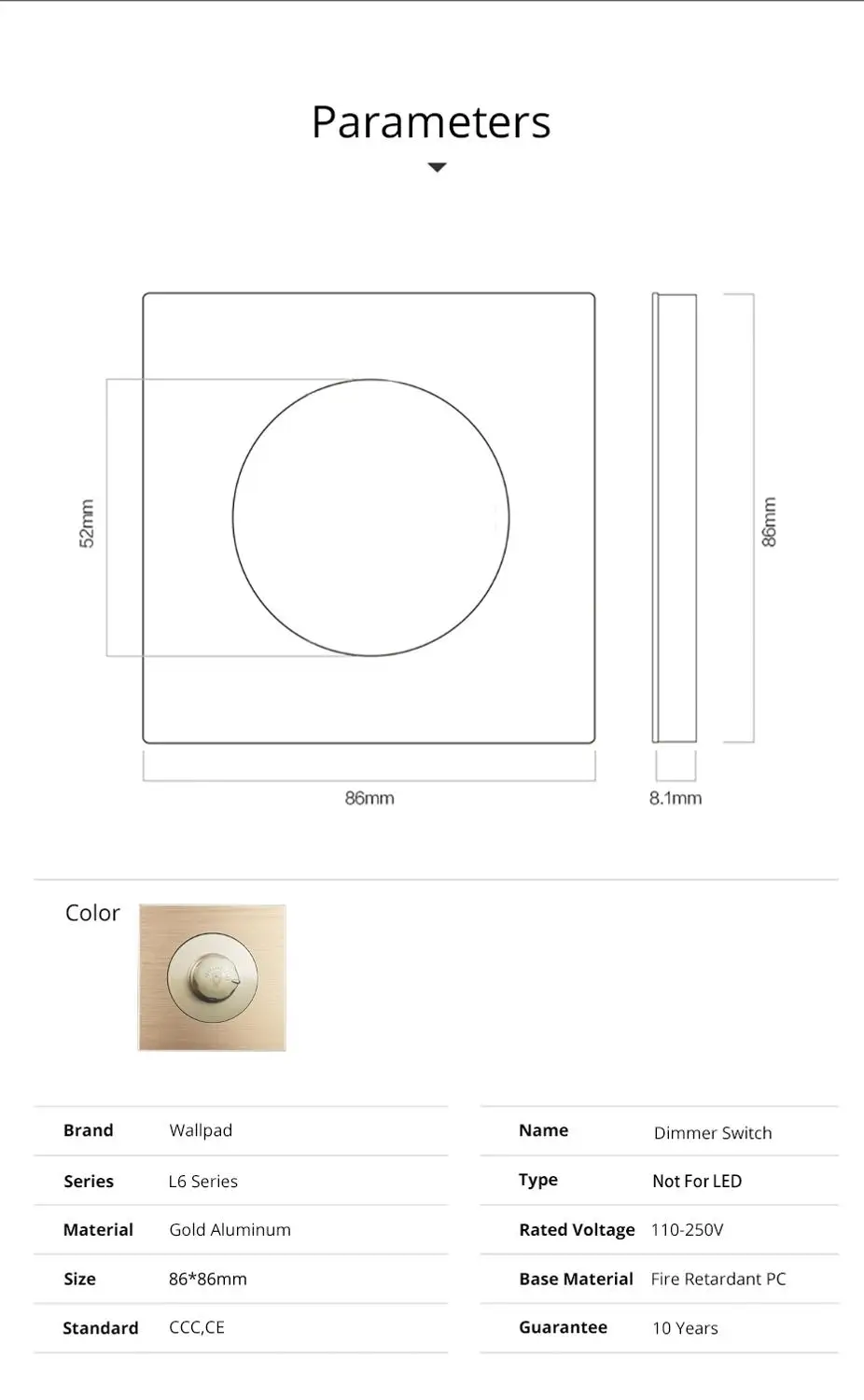 Wallpad Gold L6 одиночный диммер, контроль яркости, 500 Вт, матовая атласная Золотая алюминиевая пластина, не светодиодный