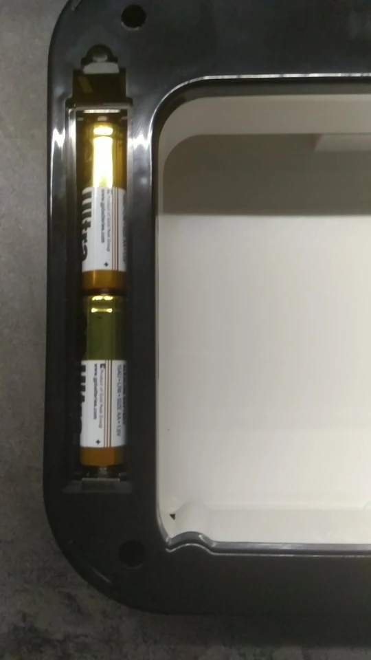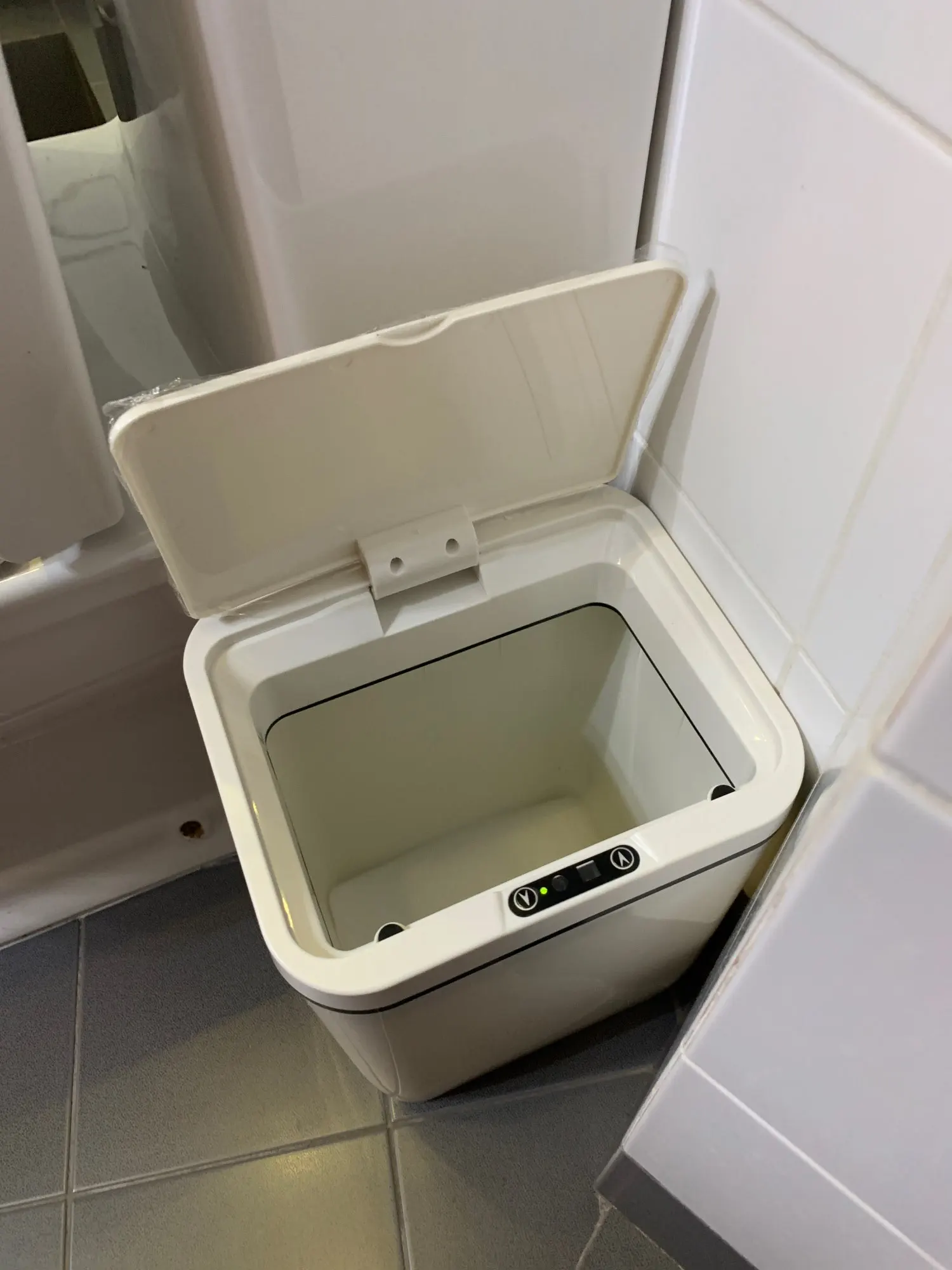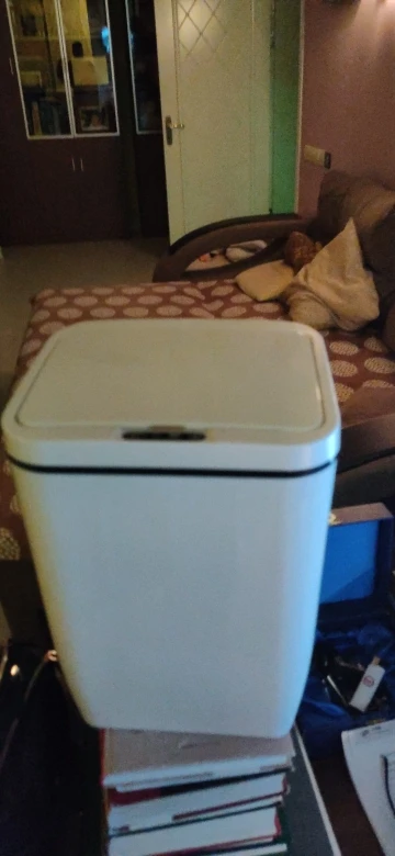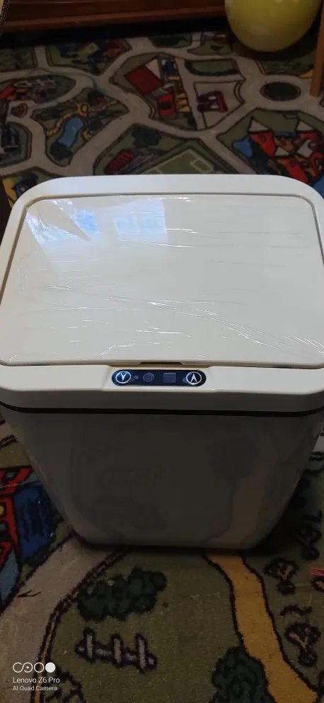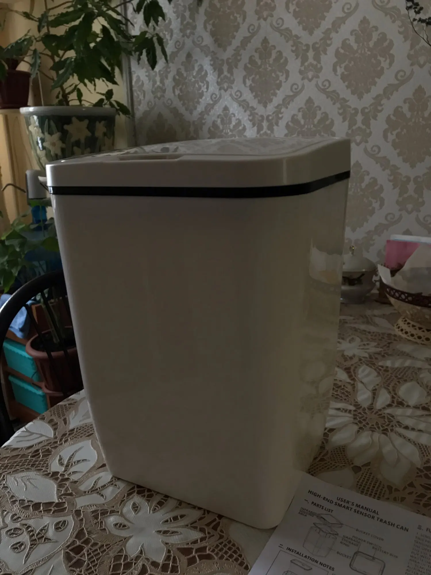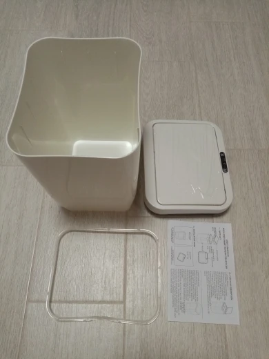 Очень аккуратно запаковано, коробка была слегка не целой, но само ведро без каких-то повреждений. Работает на 2 АА батарейках, хорошо что дома были для проверки :) Я ожидала даже чуть меньше по размеру при текущем литраже ведро, но оно идеально для ведра у рабочего места дома