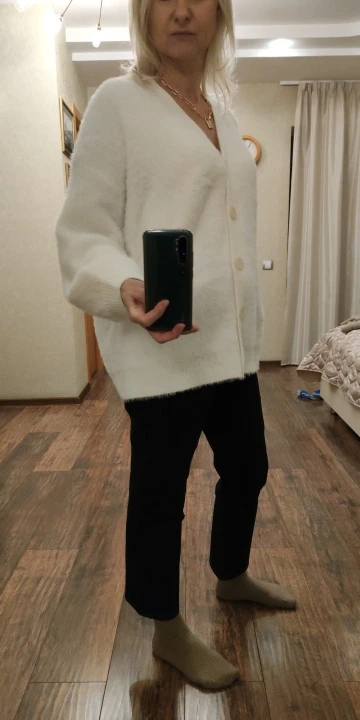 Невероятной красоты кардиган!! Только такие слова в голове. Как пушистое облачко. Очень теплый. Очень качественно сшит, красивые пуговицы! У меня 44 размер рост 173 см, я ношу 42-44 размер. На мне он сидит оверсайз, очень очень красиво. Мой пушистик)) Перемерила со всем что есть - идет ко всему и делает образ очень благородным. Выглядит дорого, интересно, суперски! Спасибо за такой качественный товар продавцу. Прибыл ща недели в Санкт-Петербург