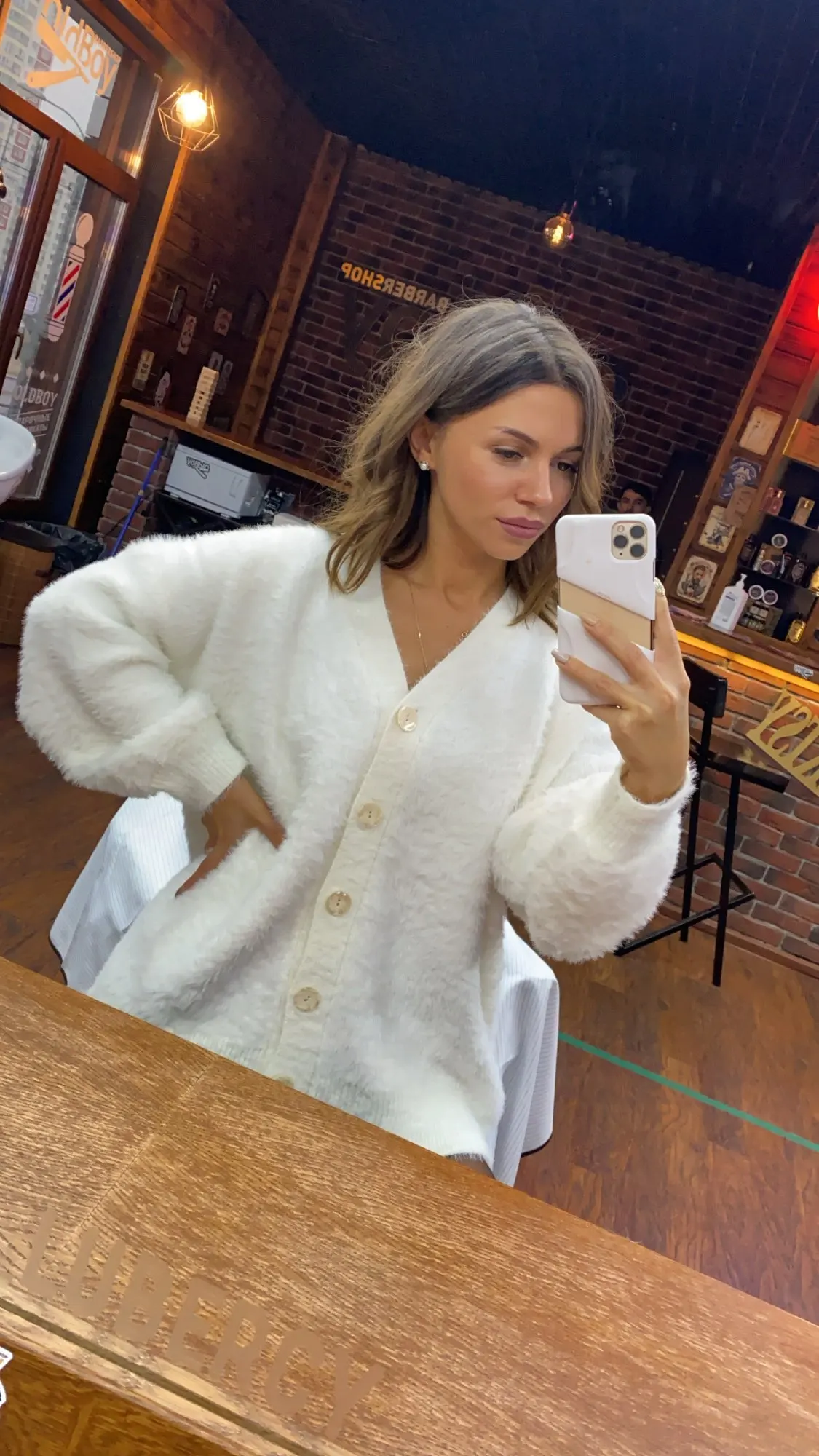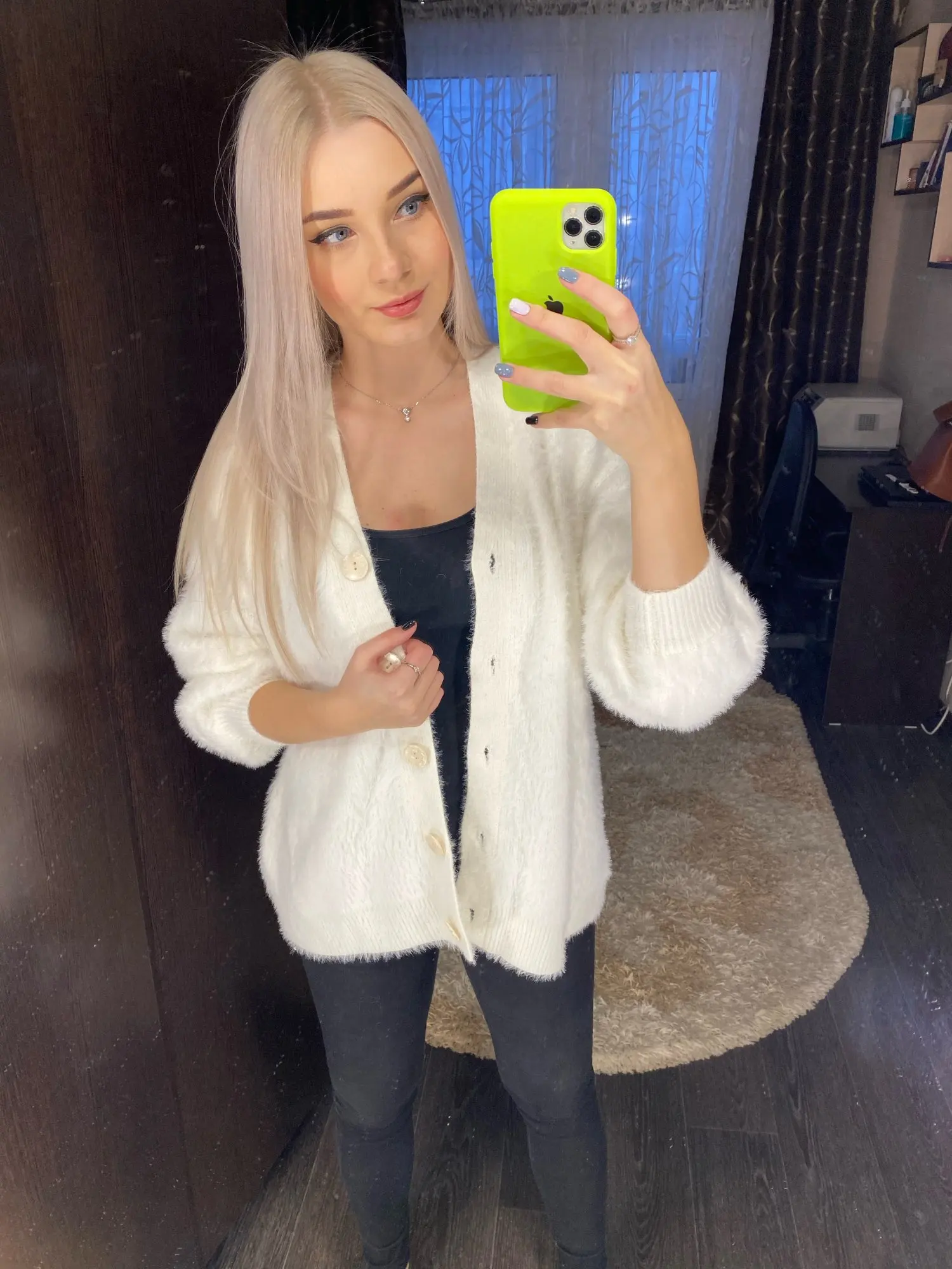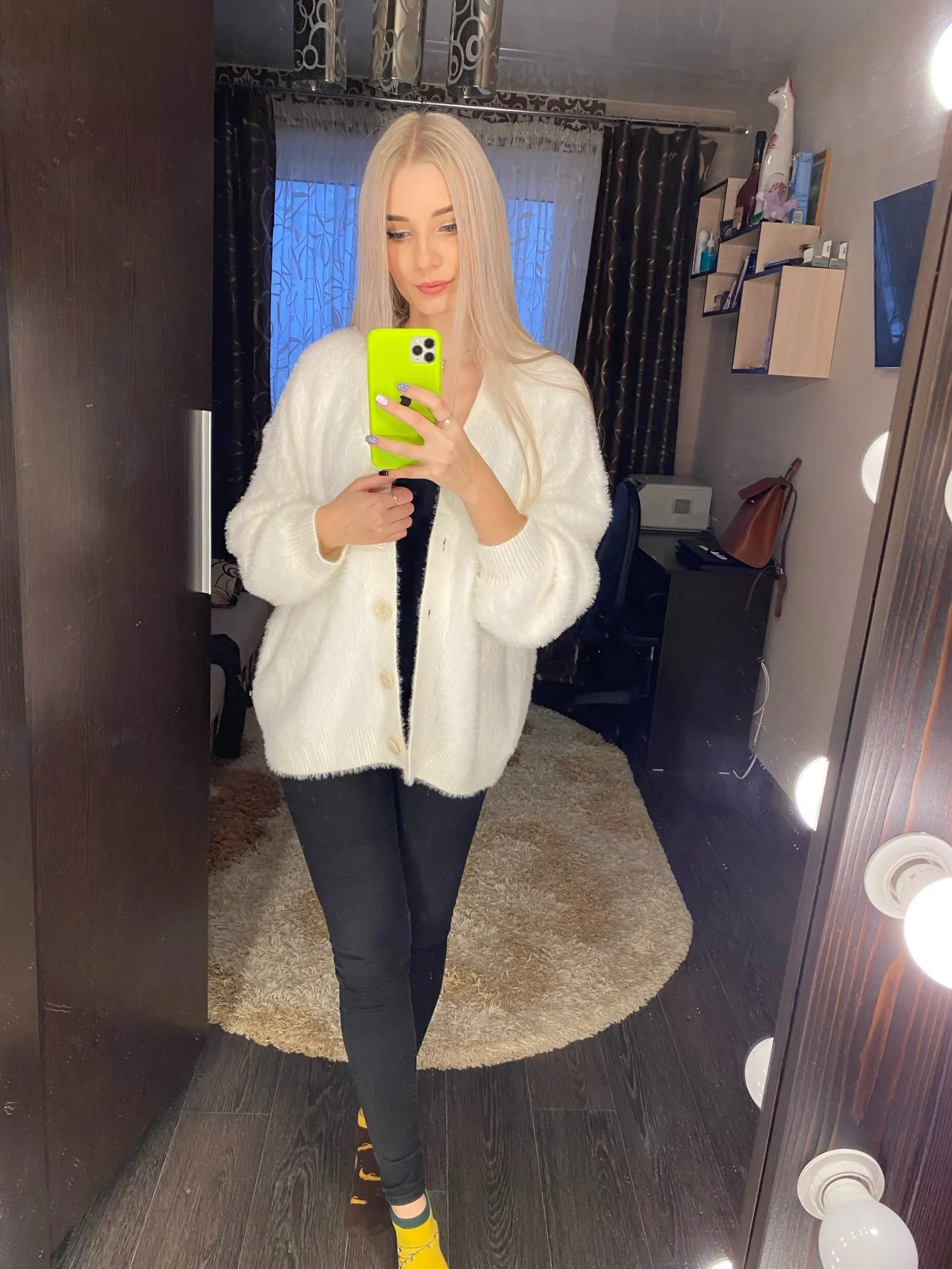 Thank you so much, seller! I have got it! So fluffy and thick fabric! Sweater's hair goes out of it and too much effort I need to clean my clothes. Hopefully it will stop after washing it. Love the oversize look on me with this size! Sleeves are wonderful length, super long, which I really love. My height is 170cm and weight is about 60kg. Actually I was thinking that I don't like buttons, let's see if ai can change them. But this is just my taste :) the length of the sweater is almost hiding my ass. Love it for cozy winters it will be amazing! Thank you once again! Fast delivery to Australia, 2 weeks (I paid extra for faster shipping)
