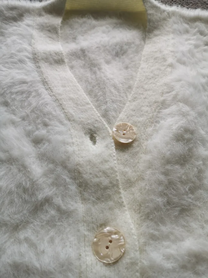 купила 11.11 за 1802р.(скидка 49р монетами, 600руб.-выиграла скидку АЛИ на покупку свыше 2т.р.) кардиган соответствует описанию, красивые пуговицы, тяжелый и мягкий, приятный на ощупь. минусы - пуговки и петли на разных уровнях, но это поправимо, планка с пуговицами и петлями пришина внатяжку и перед слегка задирается, попробую отпарить и вытянуть, а главное мне не хватает 7-10 см. длины, мой рост 168 см, попа не прикрывается полностью. пока никуда не одевала, интересно будет ли пух (похож на кроличий) налипать на другие вещи, темные брюки и юбки.