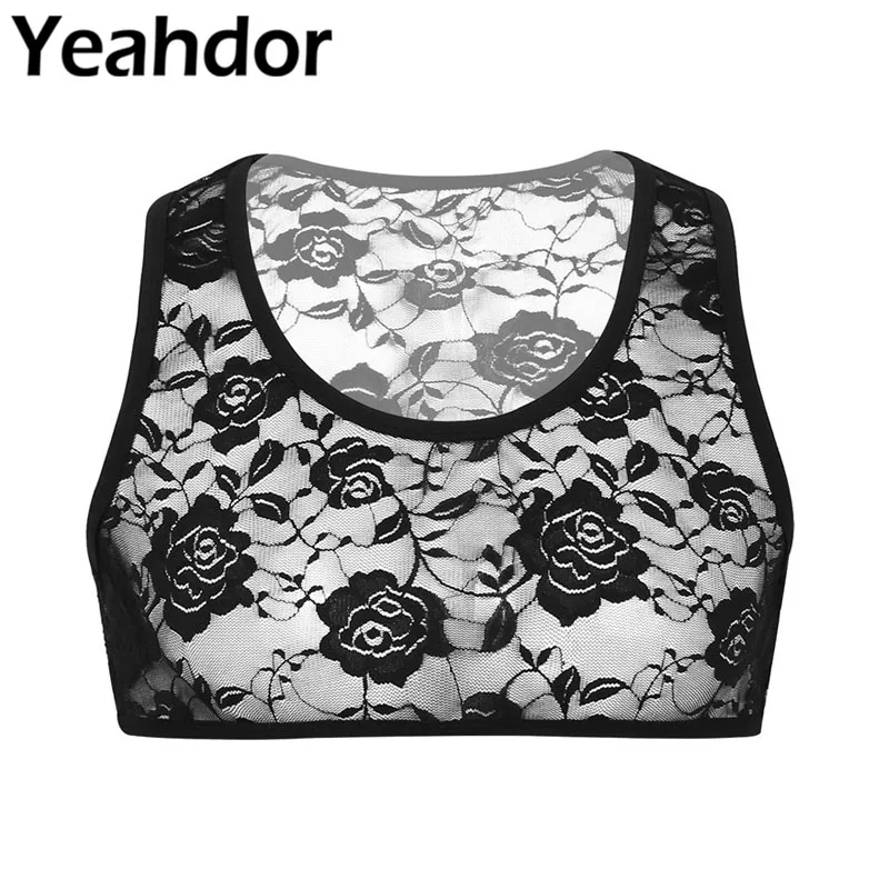 Мужские сексуальные прозрачные кружевные топы с цветочным рисунком, мужское неженское прозрачное белье, майка, ночная рубашка с глубоким U-образным вырезом, короткий топ без рукавов, укороченные топы