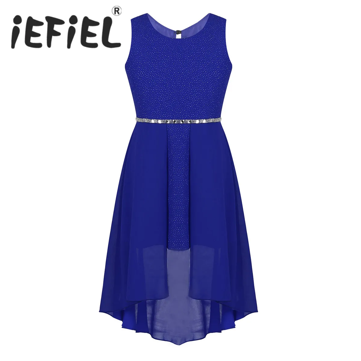 Платье для девочек, блестящее, с высокой талией и заниженным подолом