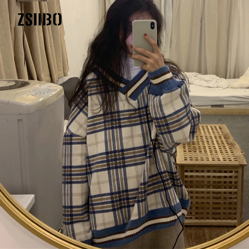 Женский клетчатый свитер с V-образным вырезом, в стиле Харадзюку