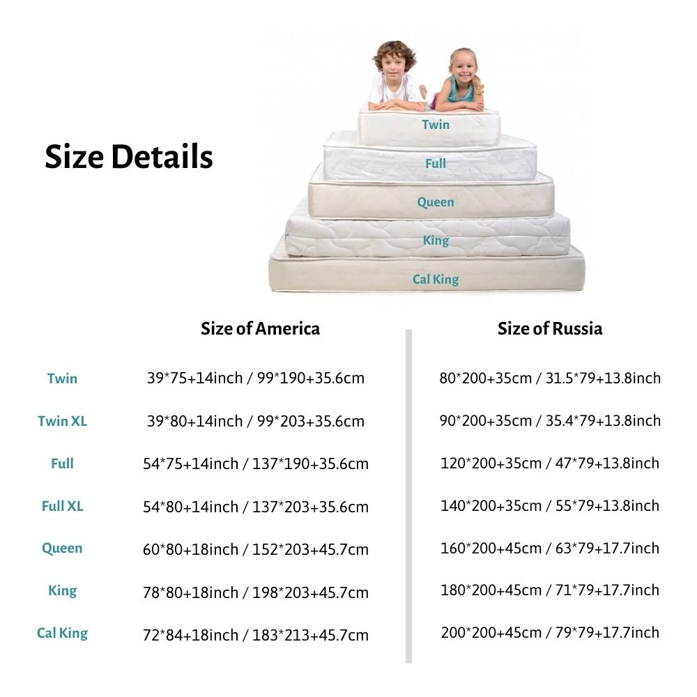 -Размер матраса определит, какой размер матраса нужен. Обратите внимание, что размеры и названия могут отличаться в разных странах.-Измерьте длину, ширину и глубину матраса, чтобы убедиться, что вы покупаете матрас, который полностью подходит для вашего матраса, чтобы вы знали, что у вас есть полная защита.-Если у вас есть какие-либо вопросы о товаре, не стесняйтесь обращаться к нам.