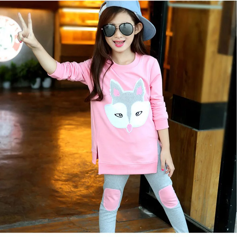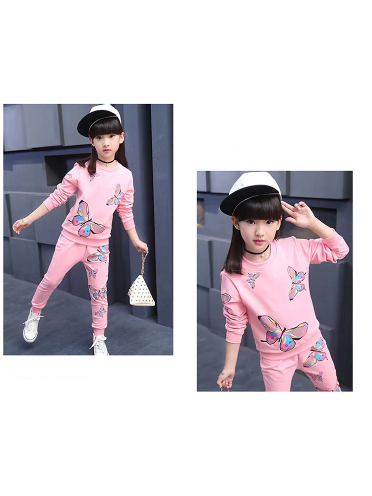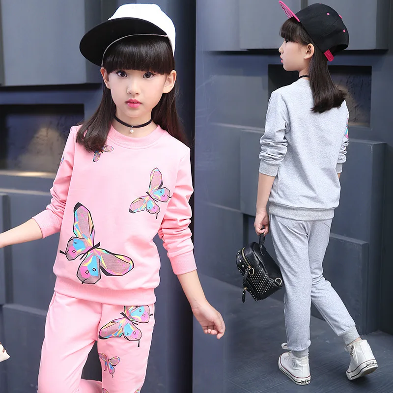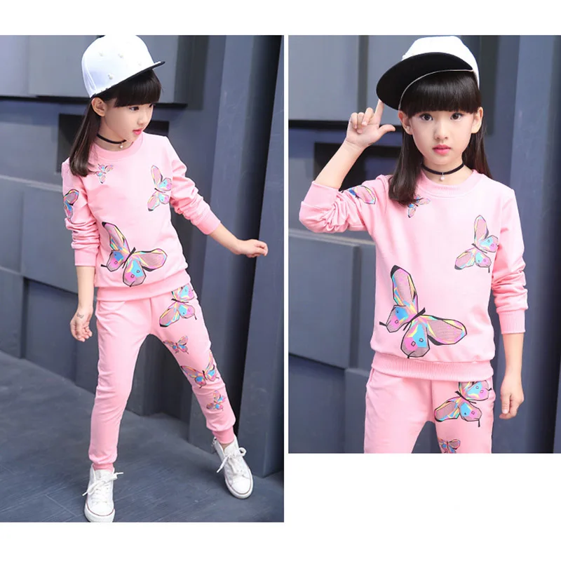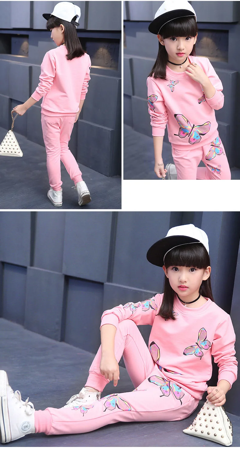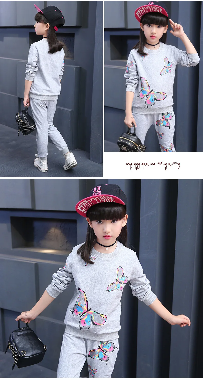 Осенние повседневные Детские комплекты одежды для девочек, рубашка с длинными рукавами и бабочками + штаны, модные спортивные комплекты одежды для девочек