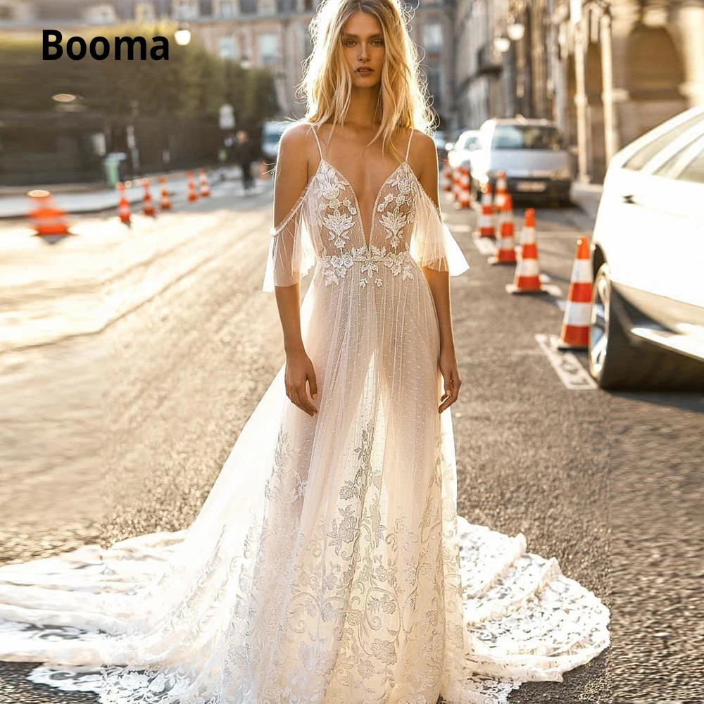 Женское свадебное платье с открытыми плечами Booma, кружевное пляжное платье из тюля с аппликацией, ТРАПЕЦИЕВИДНОЕ платье принцессы с длинным шлейфом, 2020