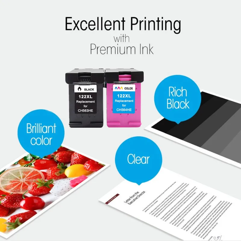 Модель: чернильный картридж для HP 122XLКод картриджа: CH563HE & CH564HEХарактеристика: ВосстановленныйОбъем: Bk-18ml, Tri-color-18mlЦвет картриджа: черный и трехцветный (C/M/Y)Выход страницы: Bk 600 страниц, трехцветные 450 страниц (формат А4, 5% покрытия)Совместимый принтер:Для HP Deskjet D1000 / 1050 / 2000 / 2050 / 2510 / 3000 / 3050A / 3052A/3054A / 3540 / 1010 / 1510 / 2540 принтеры;Для принтеров HP Envy 4500 / 5530 / 4630 / 4632.Здесь представлены не все модели принтеров. Если у вас есть какие-либо вопросы о том, может ли ваш принтер использовать картриджи, пожалуйста, свяжитесь с нами.Если ваш оригинальный чернильный картридж 122 или 122XL, наш картридж подойдет для вашего принтера.