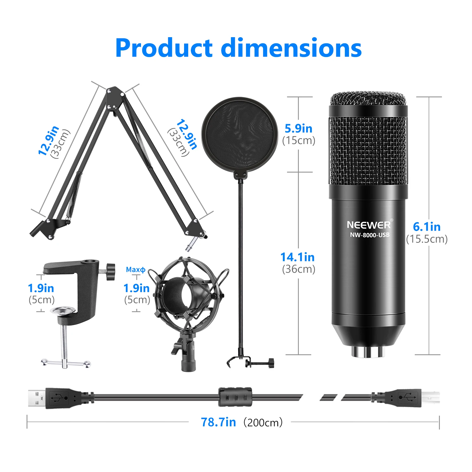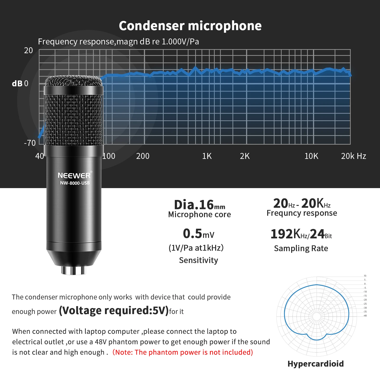 Набор микрофонов Neewer USB, Plug & Play 192kHZ/24 битГИПЭркардиоидКонденсаторный микрофон с стрелой и ударным креплением для YouTube Vlogging, GamIng, Подкачки и масштабирование вызовов, NW-8000-USB, черный