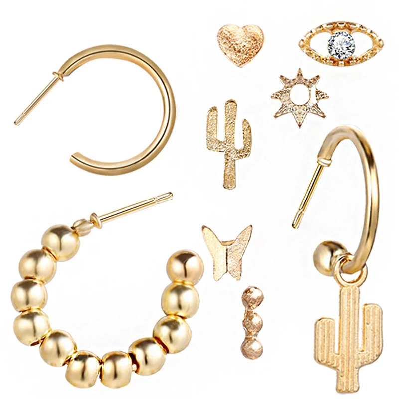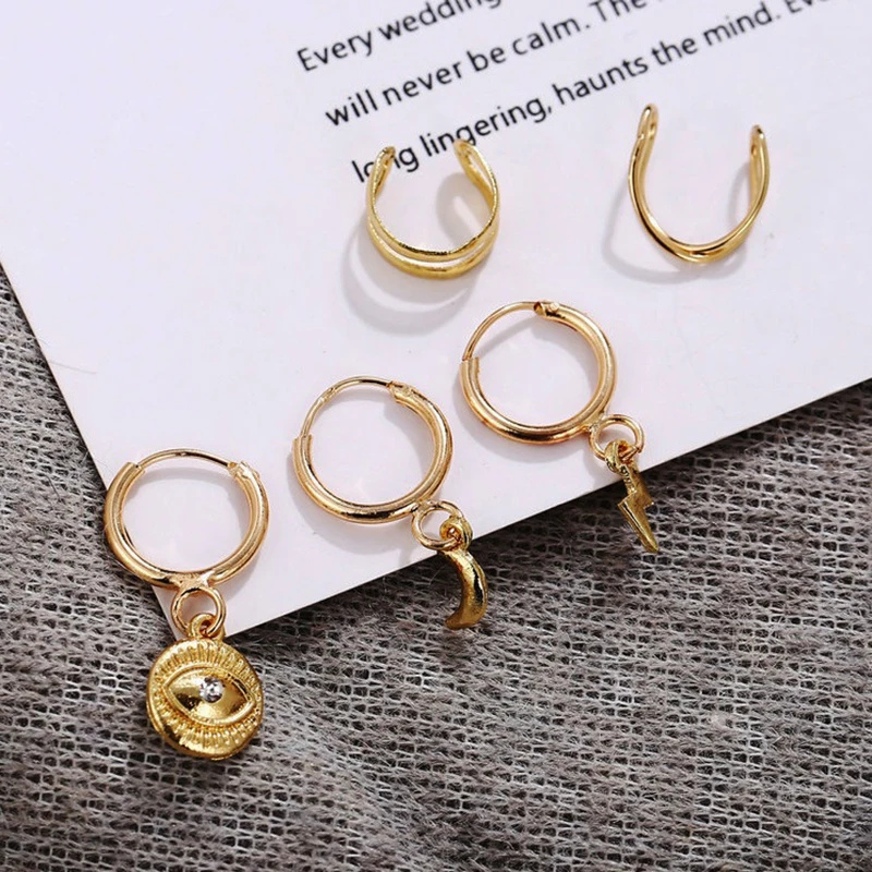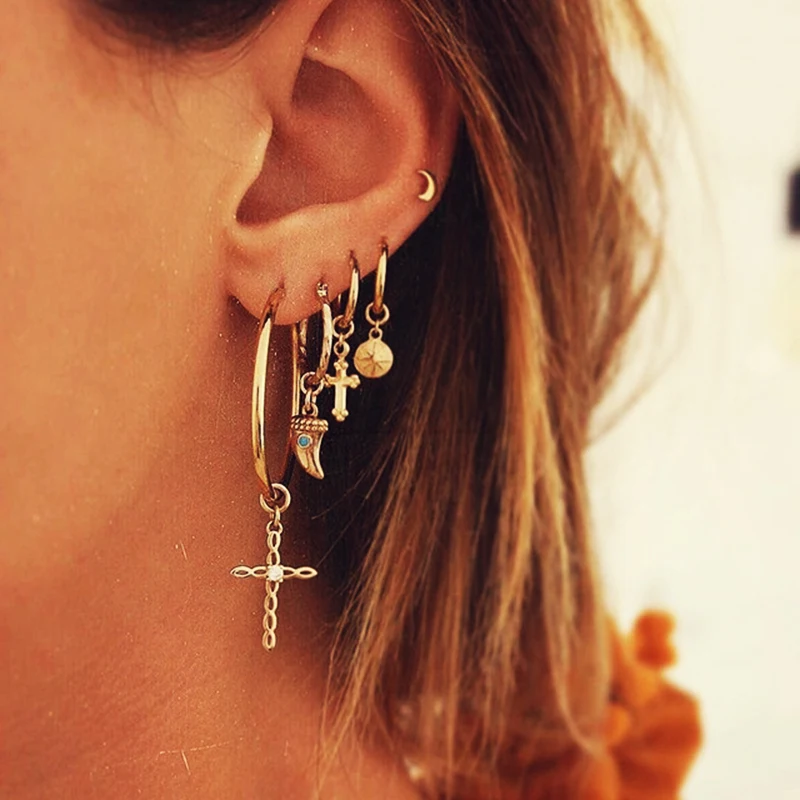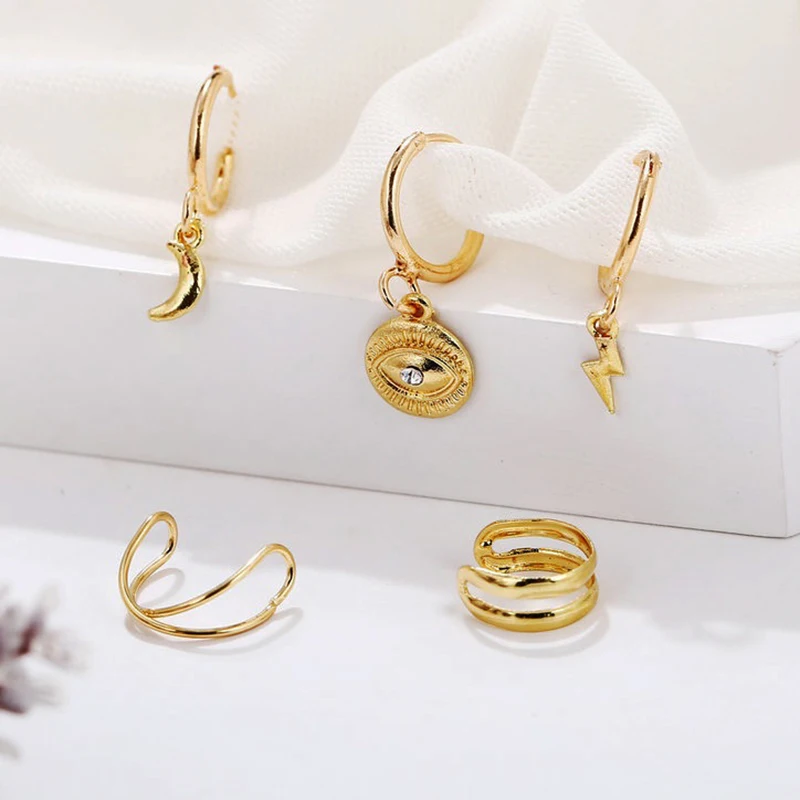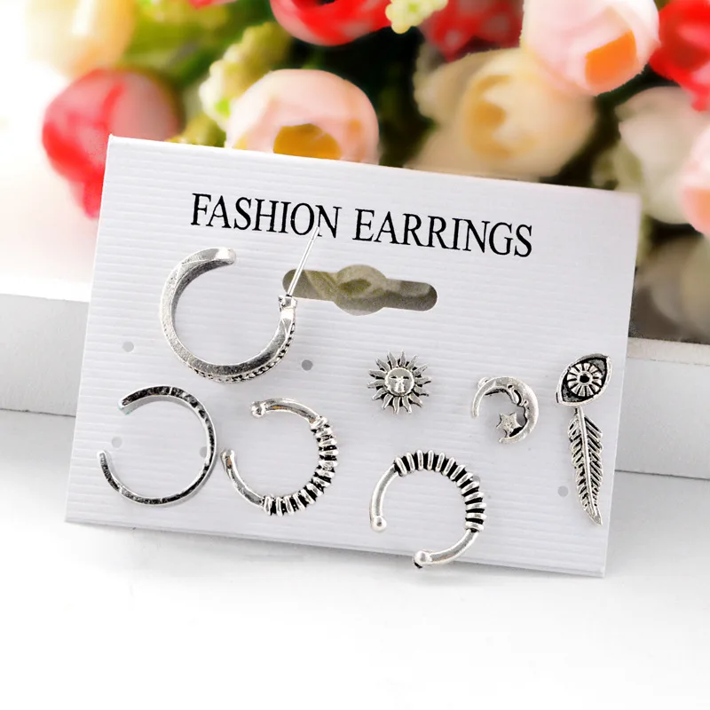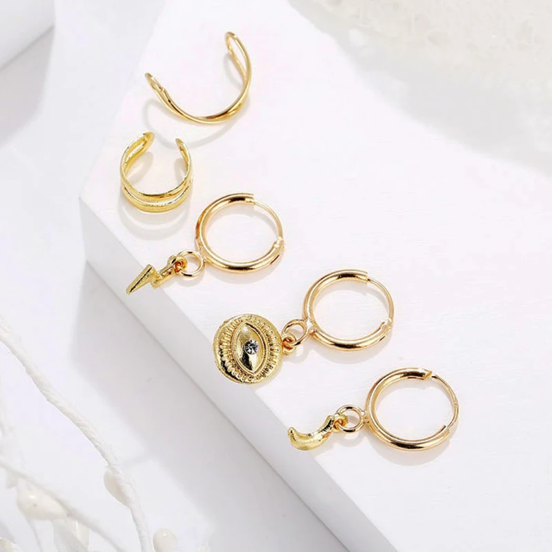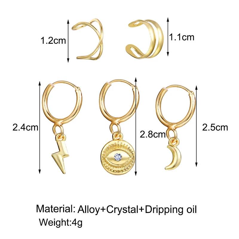 Комплект женских серег-гвоздиков в богемном стиле с кристаллами, модные серьги-обручи в форме Луны, серьга в виде клипсы, ювелирные изделия, 5 шт.лот
