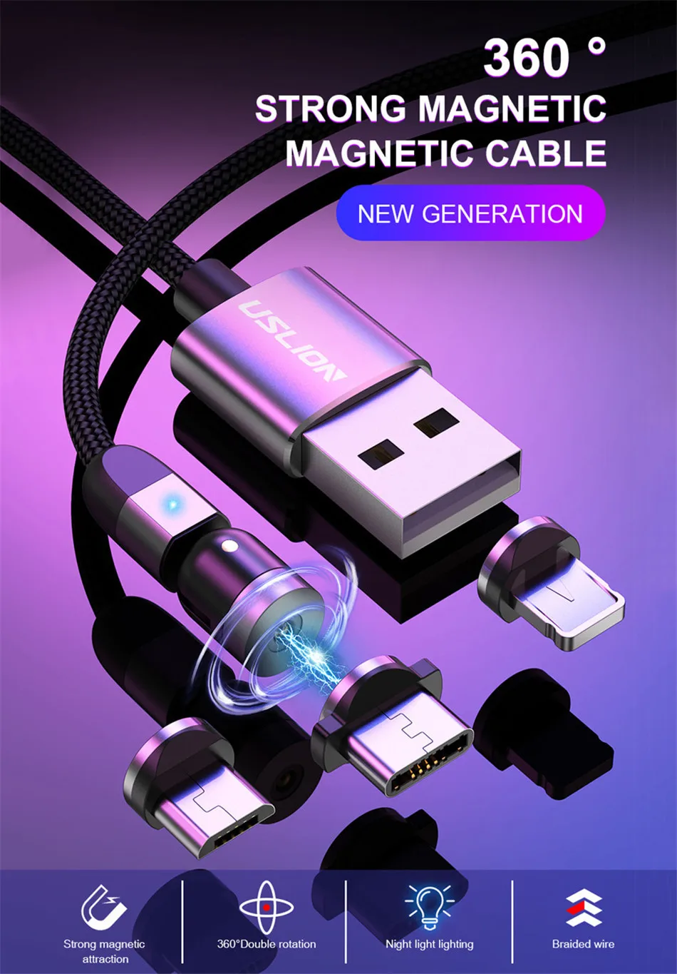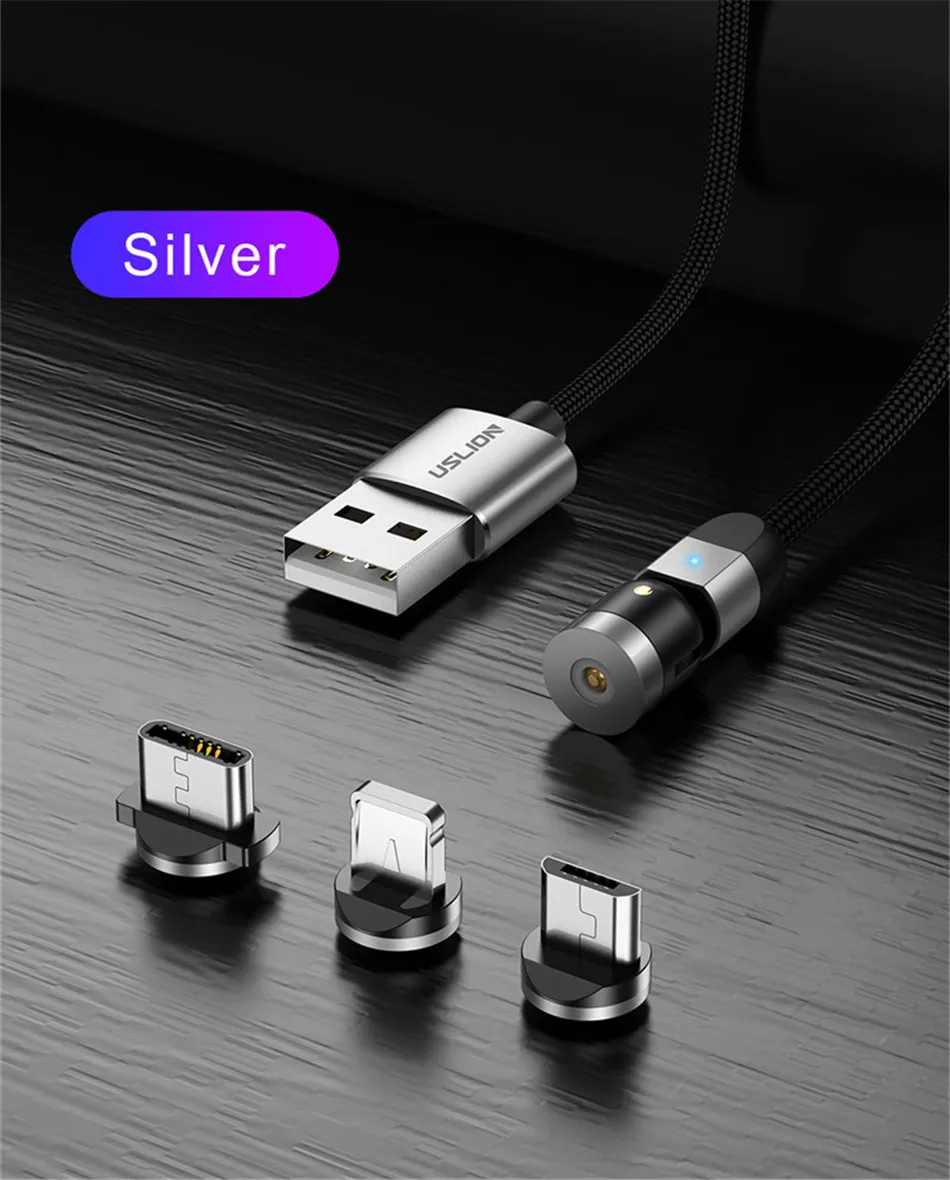 Кабель для зарядки магнитный USLION USB Type-A Type-C Micro-USB, нейлон, 0.5м 1м 3м, красныйсиреневый черный серебристый