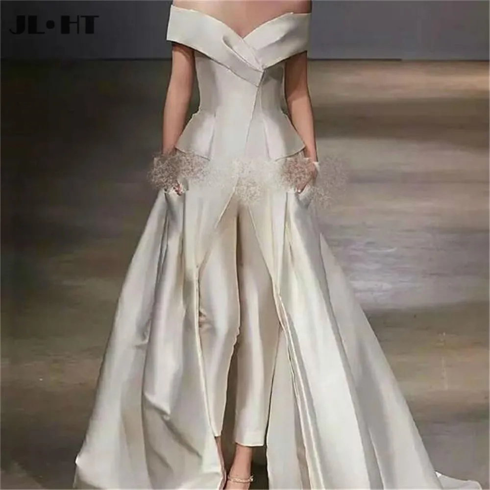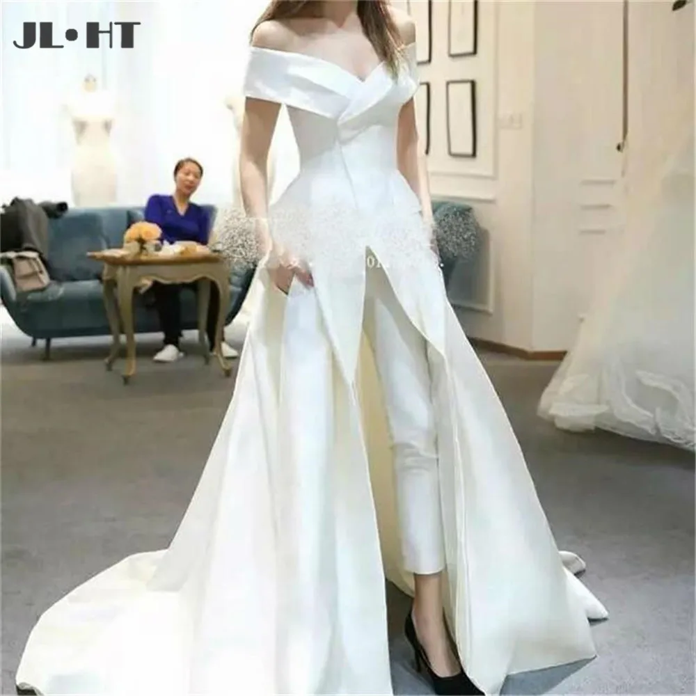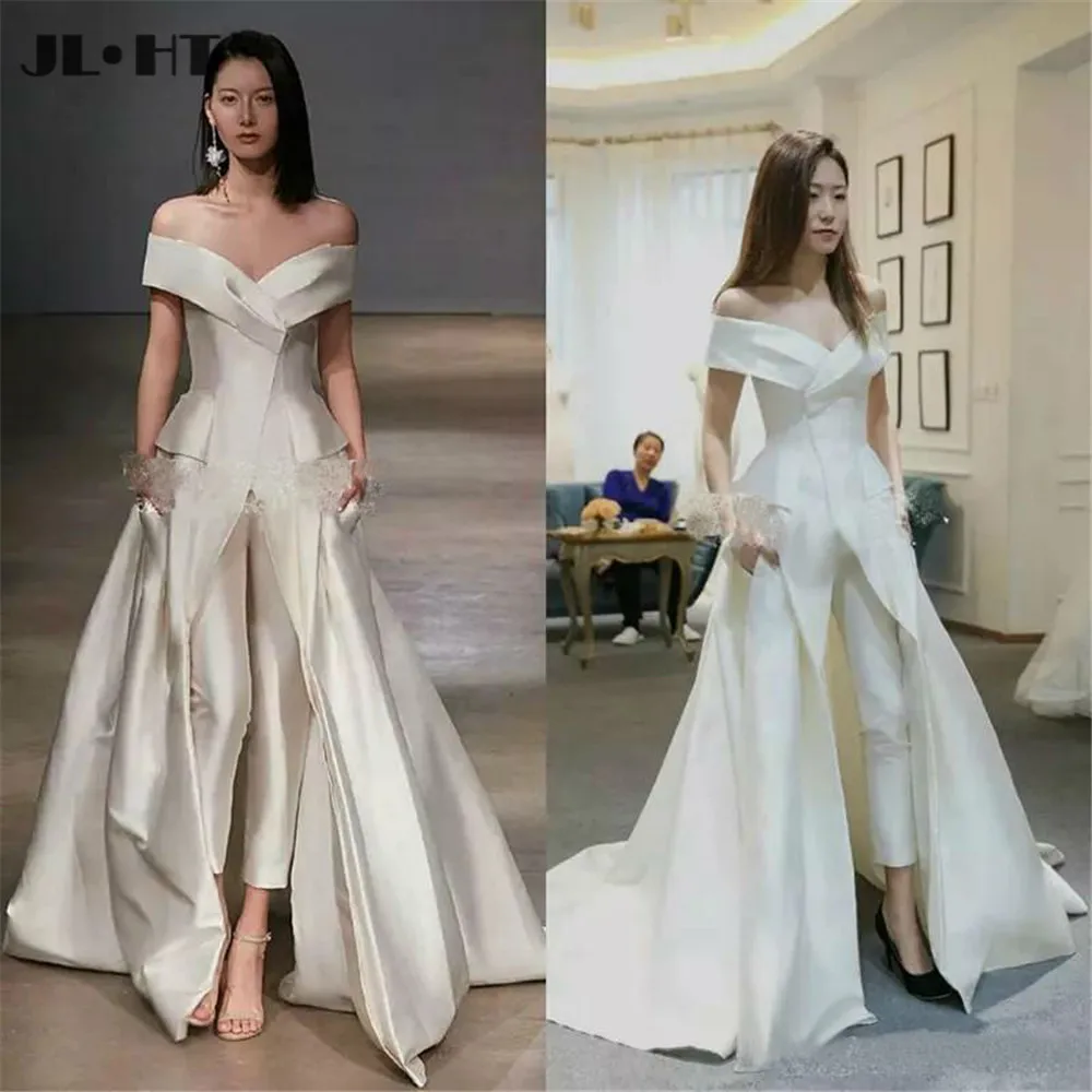 Женское атласное свадебное платье, элегантный комбинезон с открытыми плечами, трапециевидного силуэта, свадебные платья без спинки