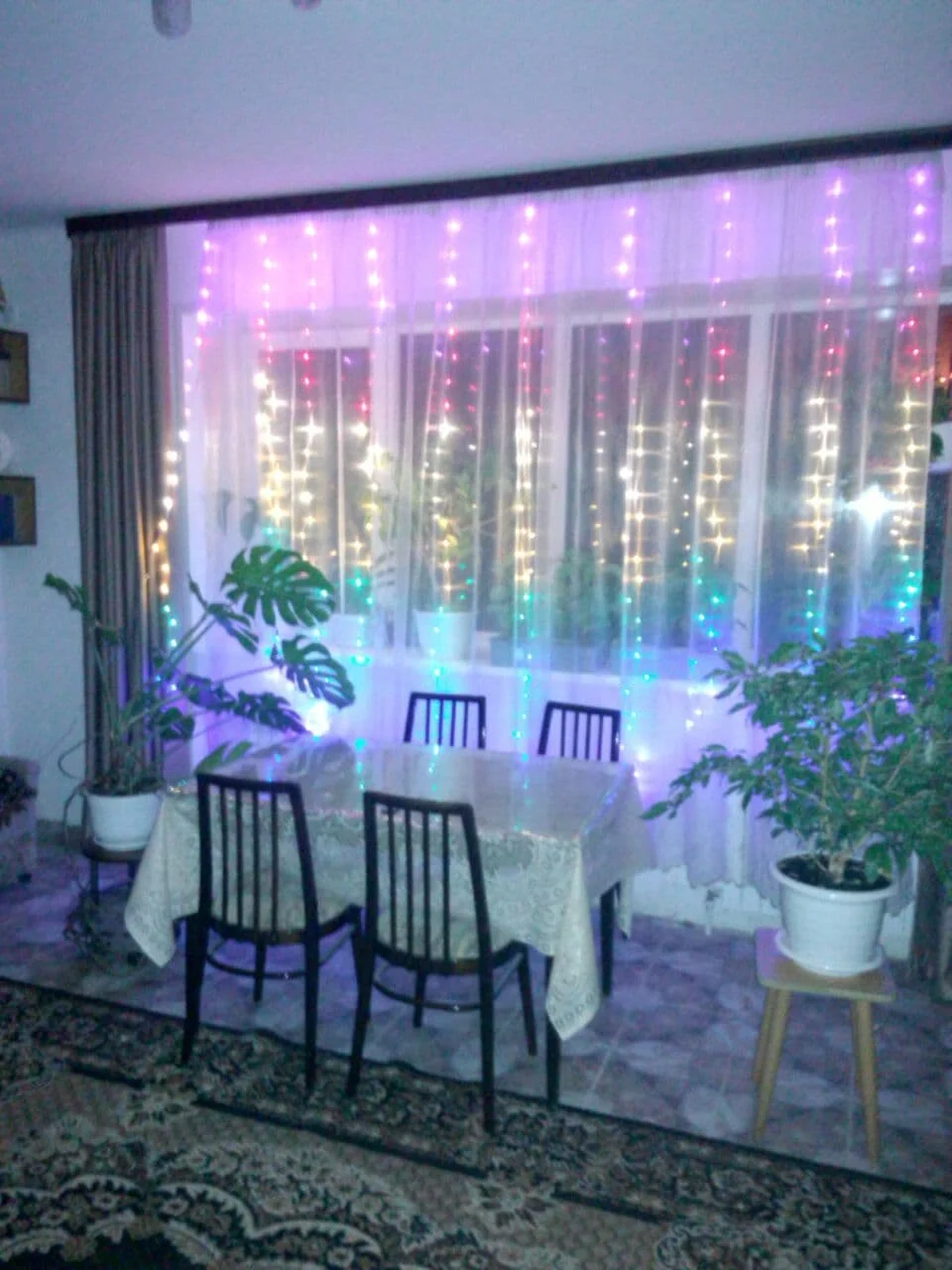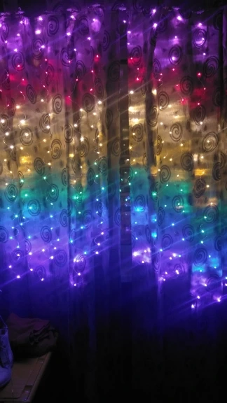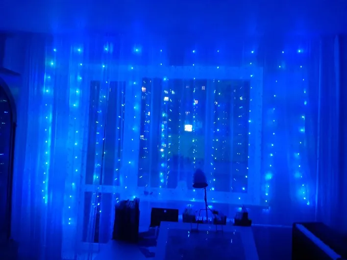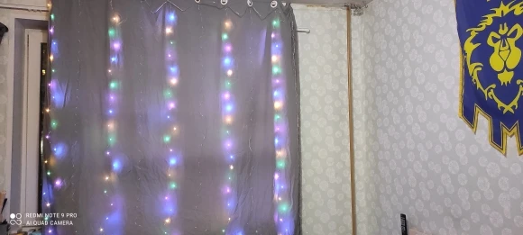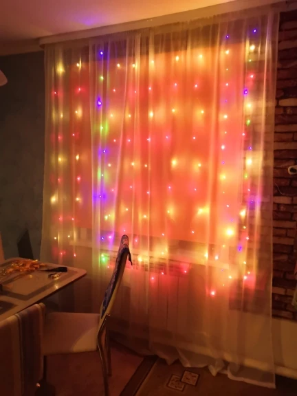 Какая же она клёвая проводки тонкие, лампочки очень яркие! Нужно аккуратно расправлять каждую из нитей: они скручены и поэтому пружинят. На фото яркость не передать, к сожалению (висит на балконе, в комнате тоже очень красиво смотрится). Покупала модель без крючков, просто пропускала нити через кольца на карнизе. Радует длинный провод. Есть мигающий режим стробоскопа - аккуратнее с ним, выносит мозг)