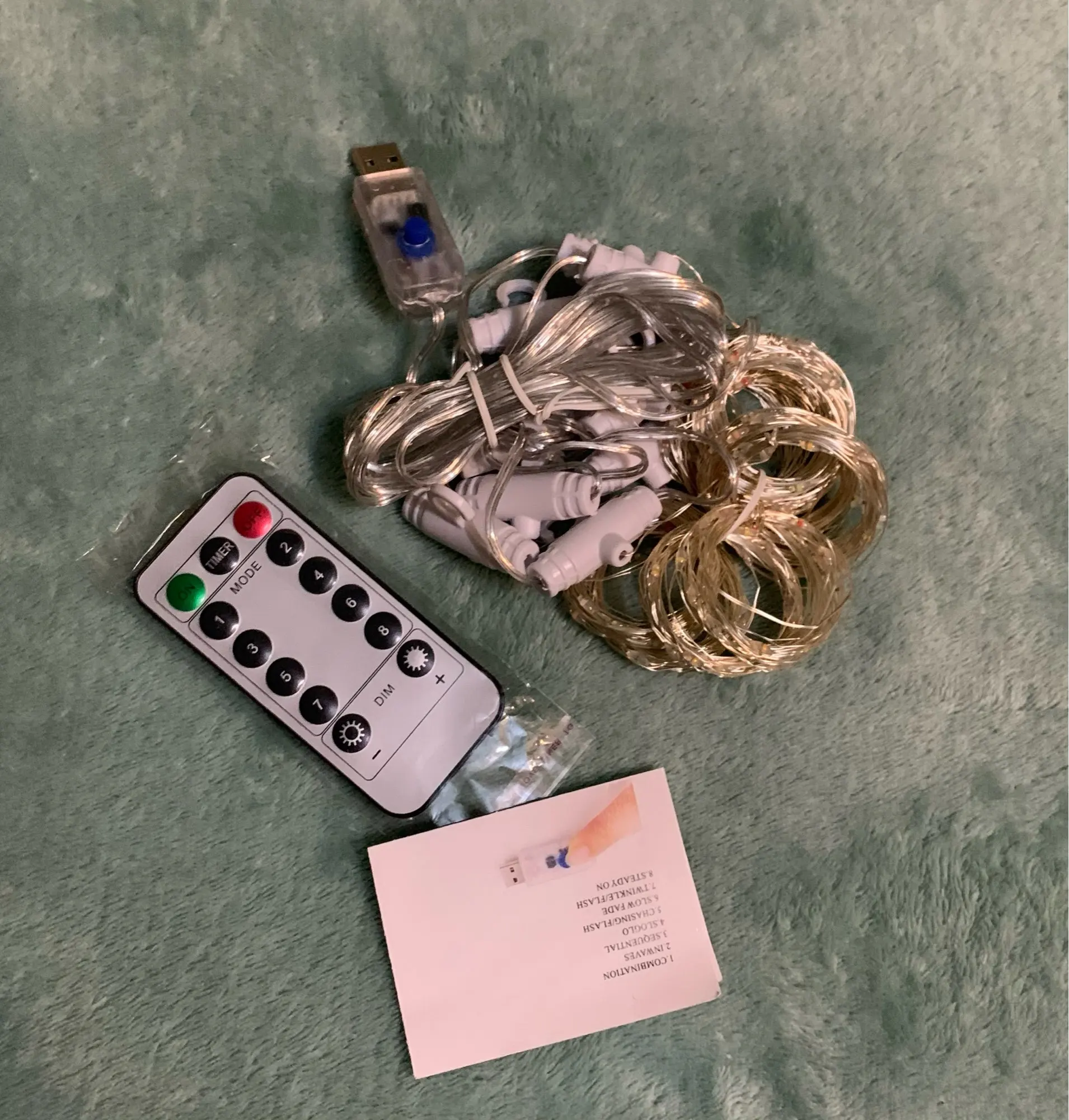 Красивая гирлянда. Провода очень тонкие, разматывать нужно аккуратно, для пульта ДУ нужна батарейка. Все работает нормально, только регулировка яркости в небольших пределах, можно было ее и не делать.