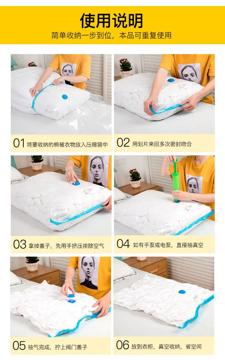 Эта сумка для хранения вакуумного уплотнения идеально подходит для всех ваших потребностей в хранении, и она поможет вамЭкономит до 75% пространства для хранения.
