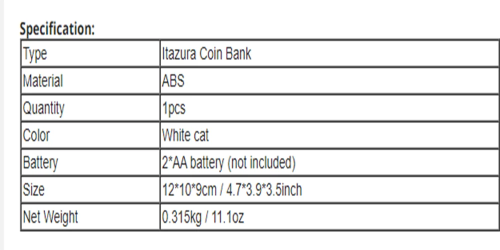 Внимание, пожалуйста, нужно поместить монету на кнопку, а затем нажать кнопку, чтобы открыть Особенности: Механический котёнок украсит ваши монеты, чтобы помочь вам сэкономить. Один из самых восхитительных банок для монет в мире. Отличная Новинка для дома и офиса. Работает на 2 батарейках AA (не входят в комплект). Положите монету в белую тарелку, и котенок поймет ее. Также отличный подарок для детей.
