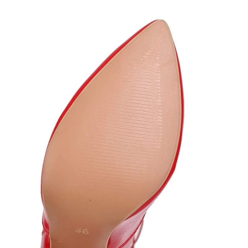Оригинальные модные сапоги до колена из лакированной кожи; Цвет черный, красный, белый; Женские пикантные стильные сапоги с острым носком Пожалуйста, используйте нашу таблицу размеров при выборе размера. Высота каблука: 10 см