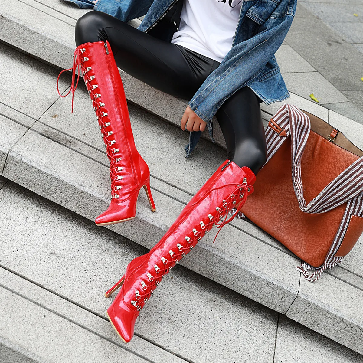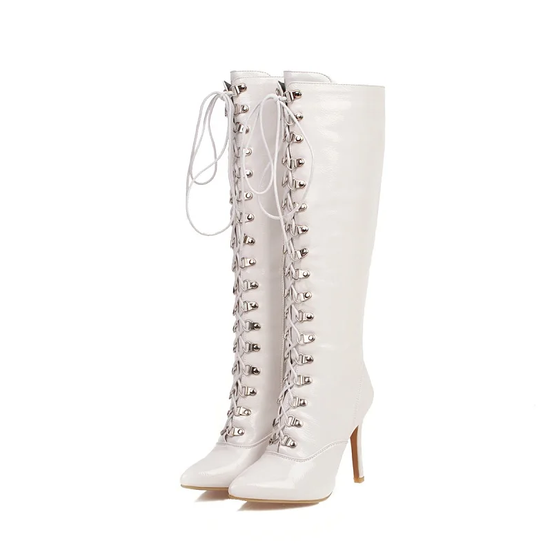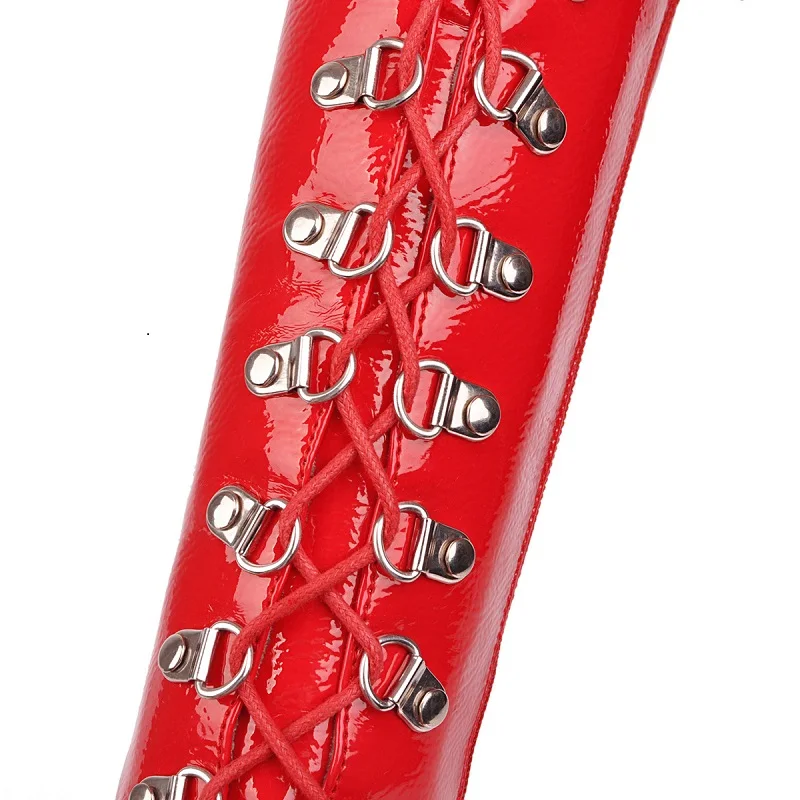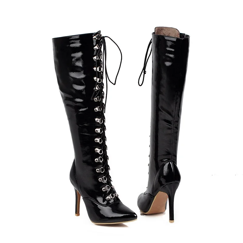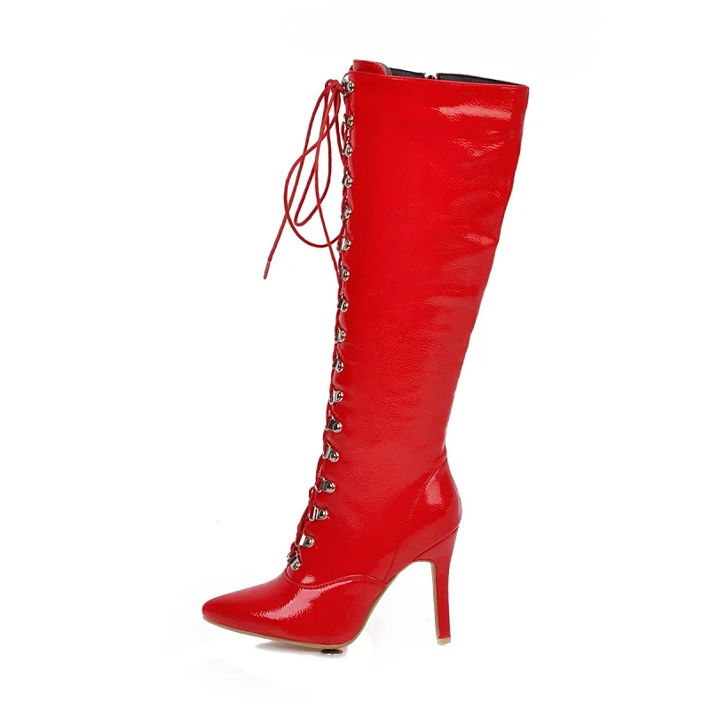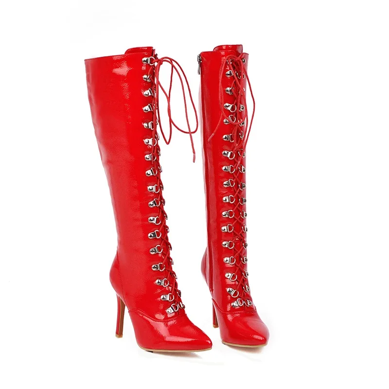 Женские лакированные сапоги до колена, черные, красные, белые сапоги с перекрестной шнуровкой, с острым носком