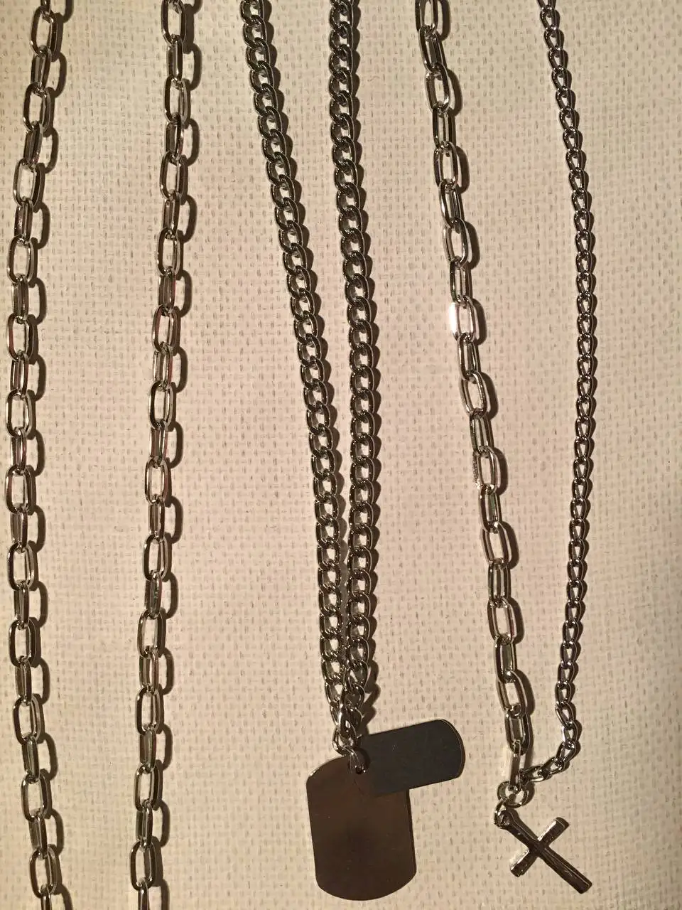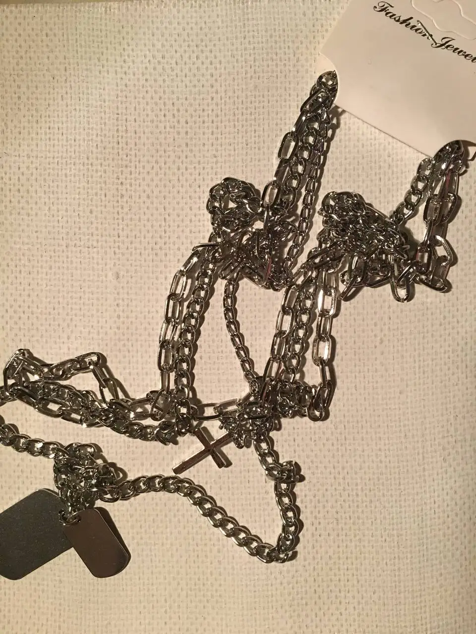 Металл белый блестящий, соответствует описанию. Три цепочки, маленькая с крестом, средняя без подвесок, большая с жетонами. Маленькая цепь состоит из звеньев разных по размеру. Не знаю должно быть так или нет. В общей массе незаметно. Дочь довольна.