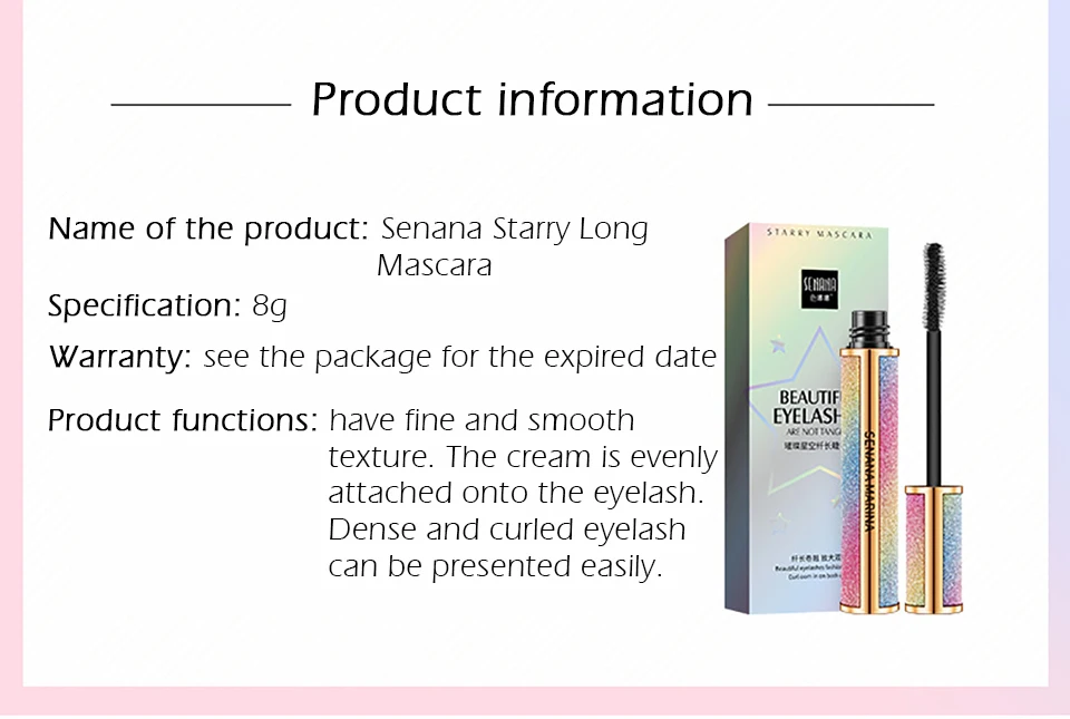 Ослепительная Звездная длинная тушь для ресниц, длинная и плотная информация о продукте Название продукта: Senana Starry Long тушь Спецификация: 8 г Гарантия: см. Посылка на истекшую дату функции продукта: имеют тонкую и гладкую текстуру. Крем равномерно крепится на ресницы. Плотные и скрученные ресницы могут быть представлены легко.