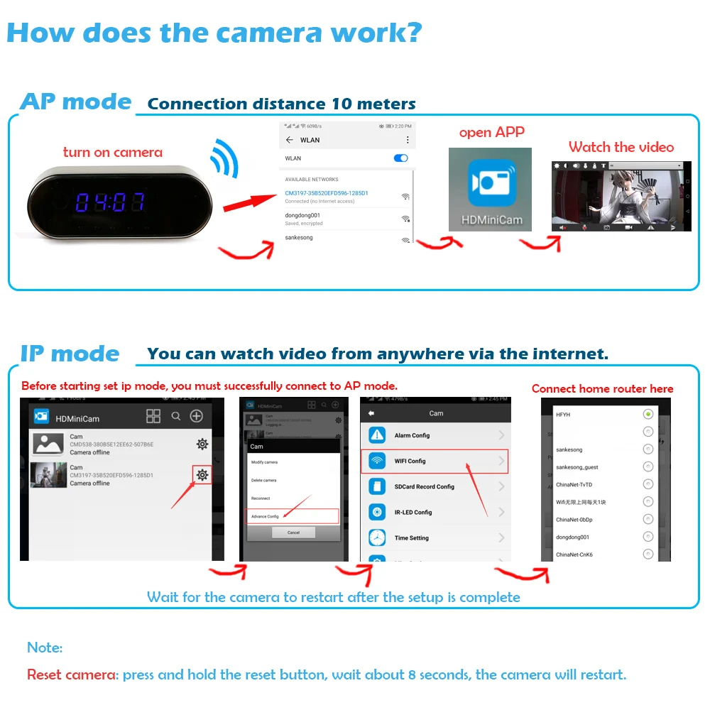 Режим P2P: Подключение на короткие расстояния. После подключения wifi к смартфону, получить видео в реальном времени через смартфон. (эффективное расстояние составляет около 4 ~ 8 метров.) Подключение Wi-Fi: Подключите камеру к маршрутизатору и настройте камеру Wi-Fi. Затем закройте AP в камере, можете смотреть под WiFi.