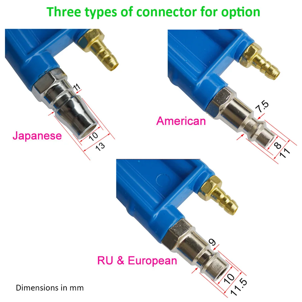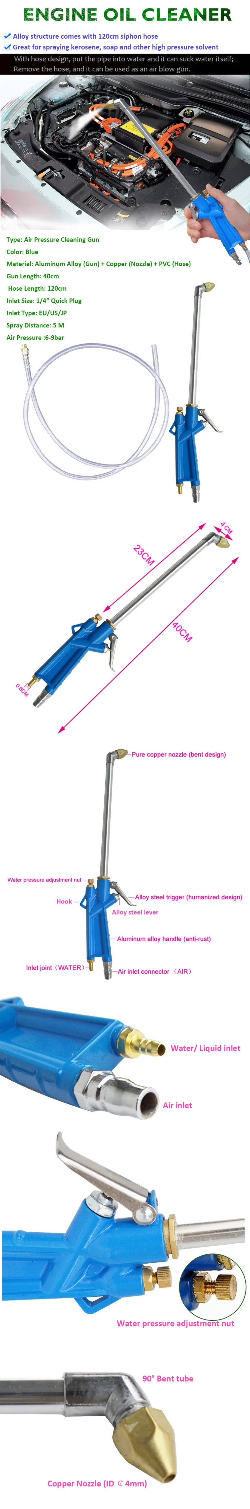 Тип: пистолет для очистки давления воздухаЦвет: синийМатериал: алюминиевый сплав (пистолет) + медь (сопло) + ПВХ (шланг)Длина пистолета: 40 смДлина шланга: 120 см