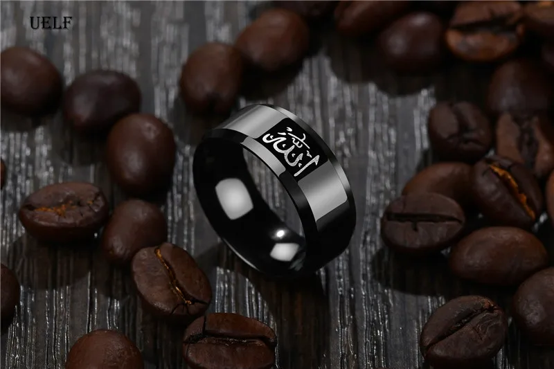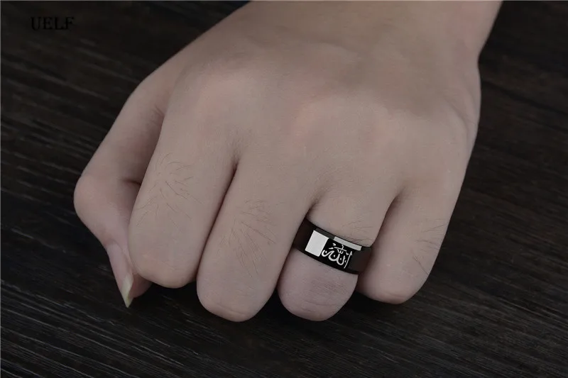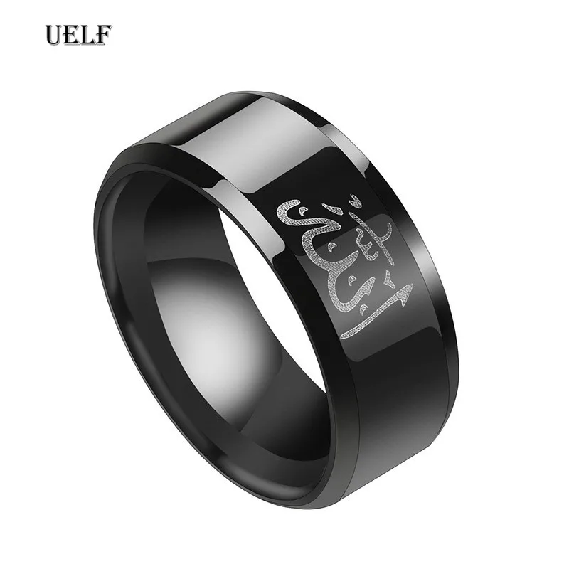 Мусульманское кольцо Uelf 8 мм из нержавеющей стали для мужчин и женщин, изящные черные арабские Исламские мусульманские кольцо с надписью Allah, религиозная бижутерия