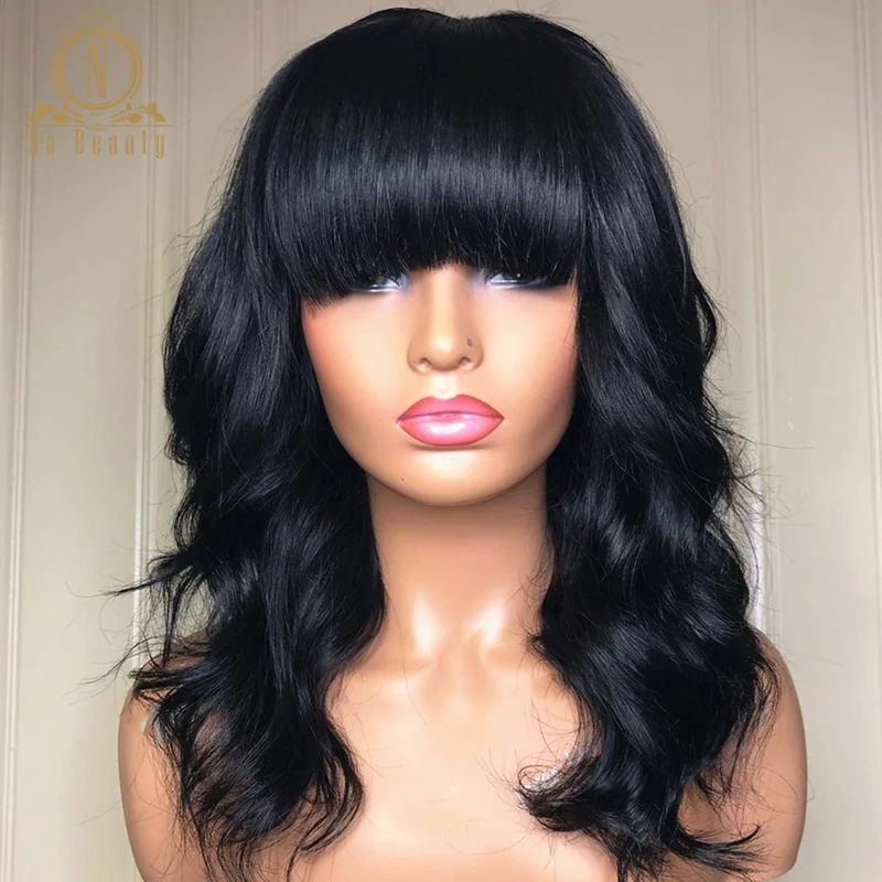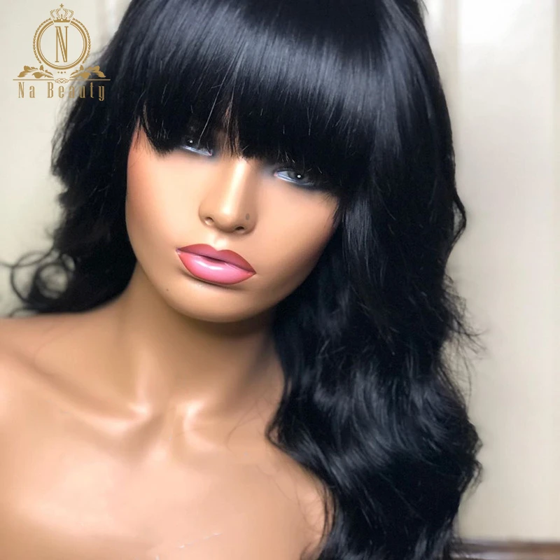 Парик бахрома челка человеческие волосы тела волна 13x4 прозрачный кружевной фронтальный парик предварительно выщипанные с челкой парик для женщин человеческие волосы Nabeauty