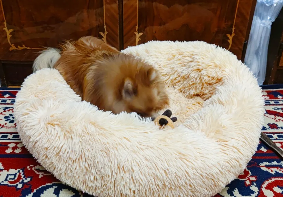 Собаке понравилось, качество супер,мягкая и очень классная набивка мягкая и плотная одновременно, заказала 50 см для мини йорка просто супер подошло , ничем не пахнет, цвет насыщенный и красивый , сама бы спала в такой лежанке