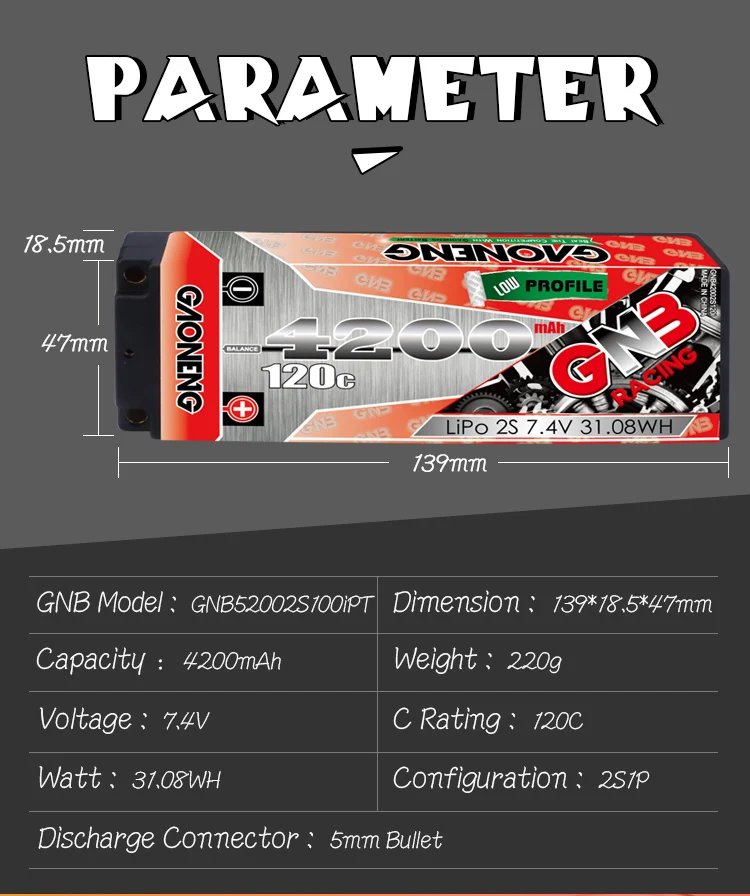 Емкость: 4200 мАч Напряжение: 7,4 в Вес: около 220 г Скорость разряда: 120C Ячейки: 2S1P Штепсельная Вилка: штепсельная вилка XT60/ T Размер: 139x47x18.5мм