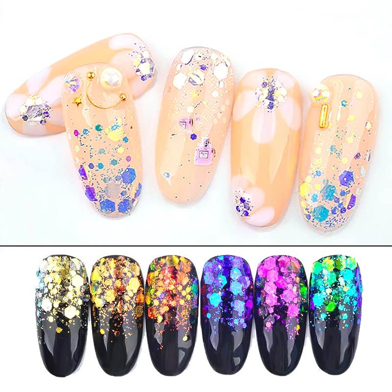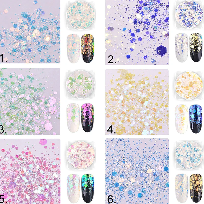1 Набор = 6 коробок, блестящие шестигранные хлопья для ногтей, 6 цветов, радужные свободные крупные хлопья разных размеров, блестящие хлопья для маникюра