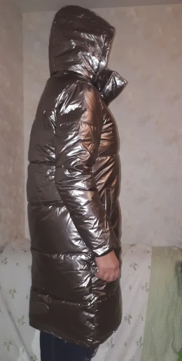Очень классный пуковик блестящий коасивый выглядит дорого . На рост 160 чуть ниже колена , 48 размер село как надо