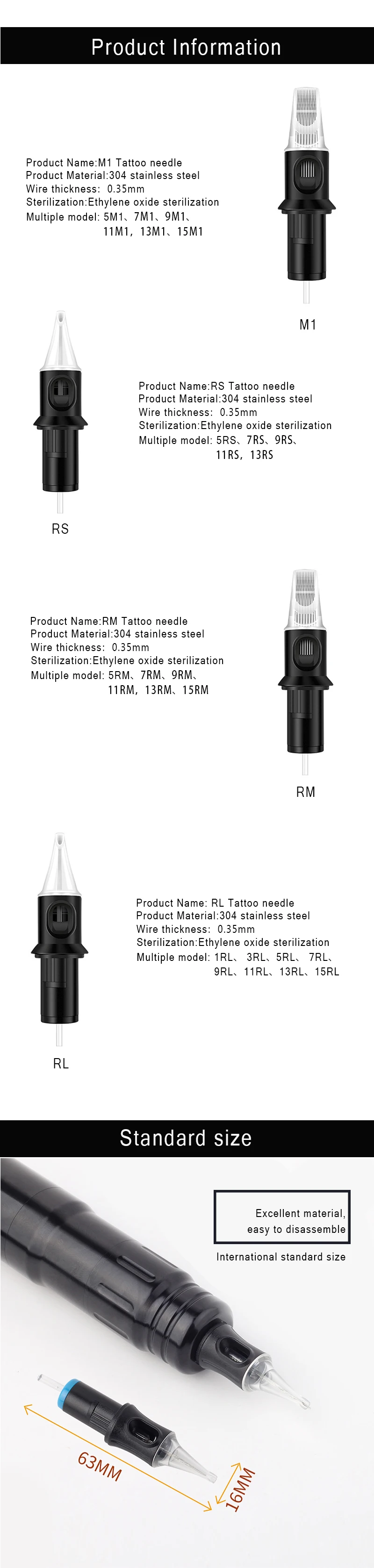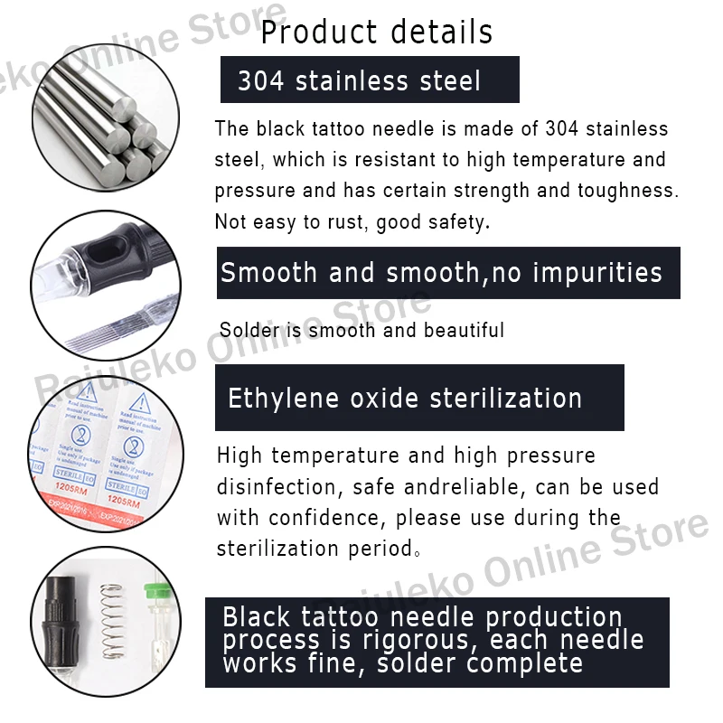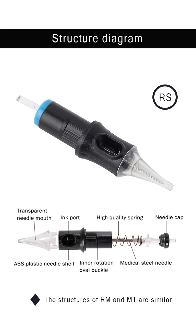 1. Игла для татуировки картриджа изготовлена из 316 медицинской нержавеющей стали и 100% стерилизована и упакована в блистерную упаковку.