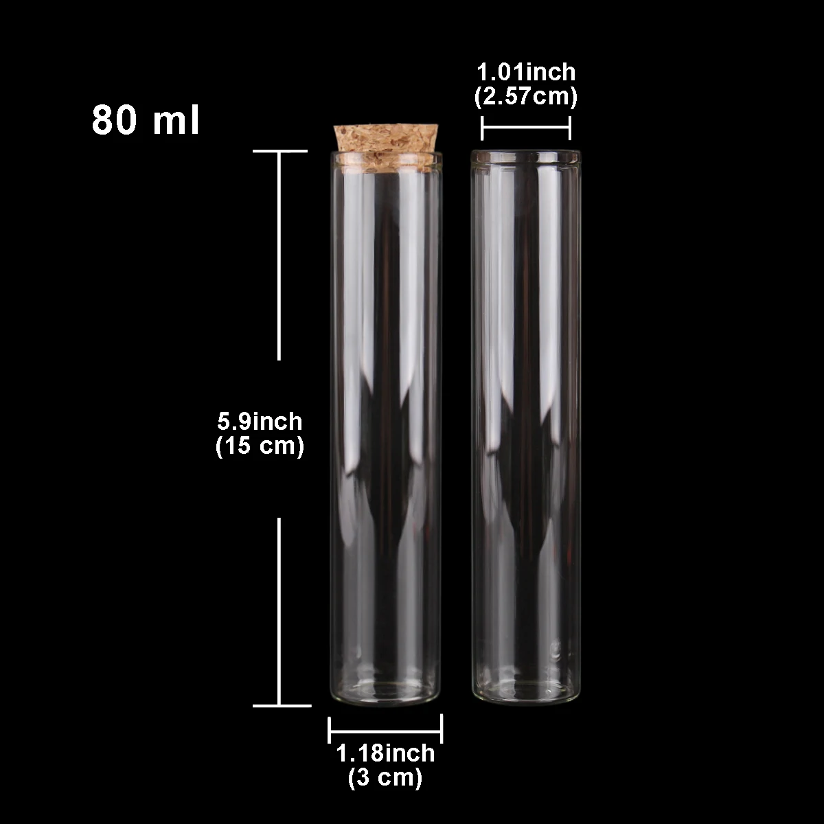 Диаметр: 1,18 ''(3 см)Высота: 5,9 "(15 см)Открытие: 1,01 ''(2,57 см)Емкость: 80 млЦвет: прозрачныйКоличество: 24 шт 80 мл 30*150 мм пробирки с пробковой пробкой