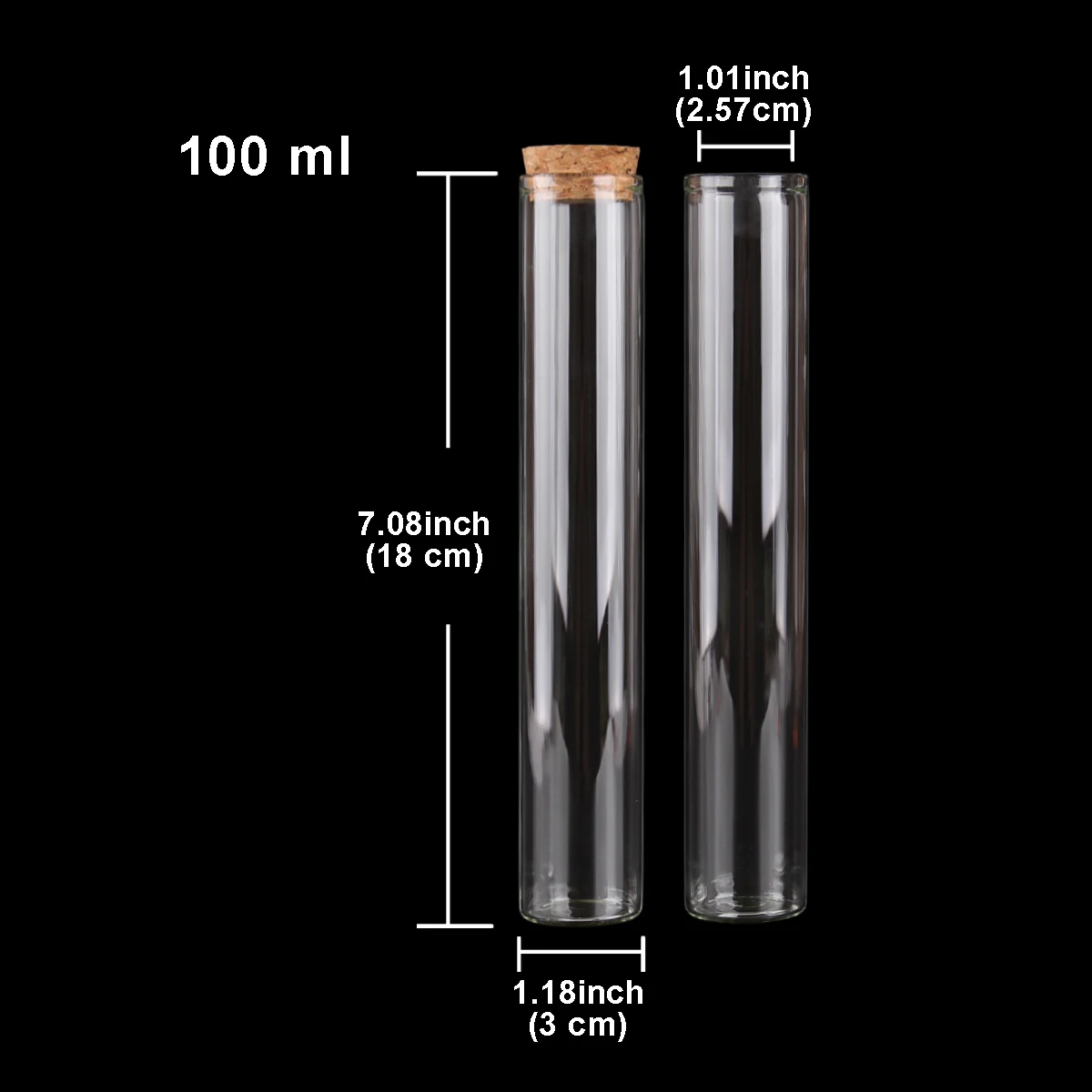 Диаметр: 1,18 ''(3 см)Высота: 7,08 ''(18 см)Открытие: 1,01 ''(2,57 см)Емкость: 100 млЦвет: прозрачныйКоличество: 24 шт 100 мл 30*180 мм пробирки с пробковой пробкой
