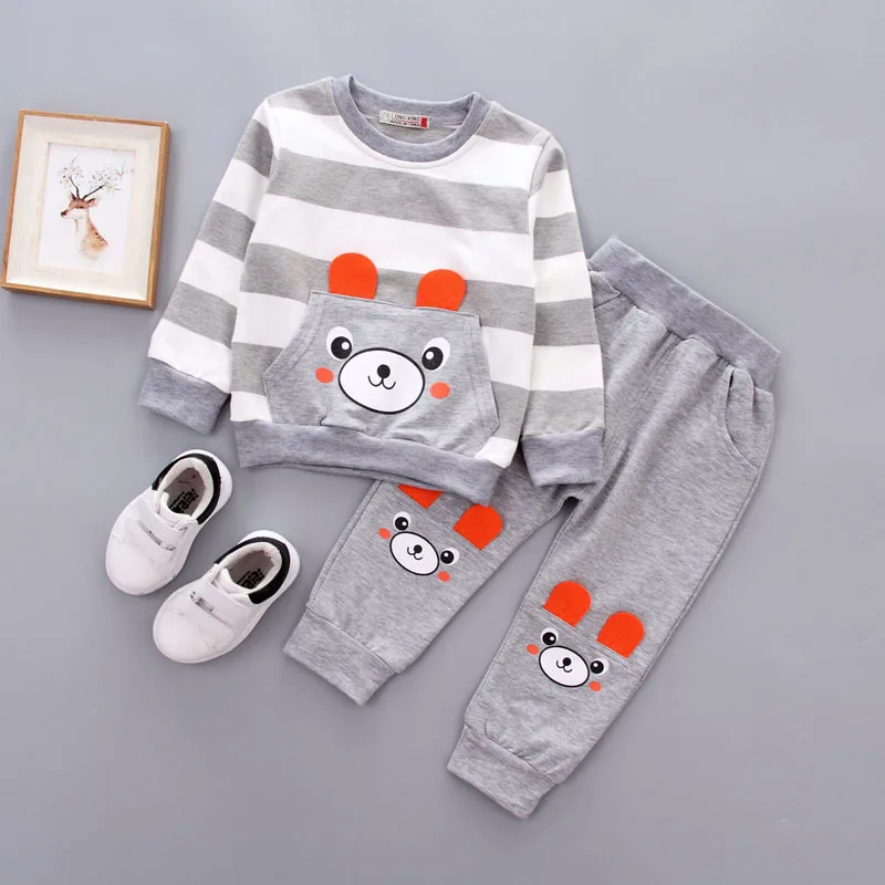 Одежда для маленьких мальчиков весенние полосатые футболки с длинными рукавами и круглым вырезом с рисунком медведя + штаны Одежда для мальчиков младенцев Детские спортивные костюмы
