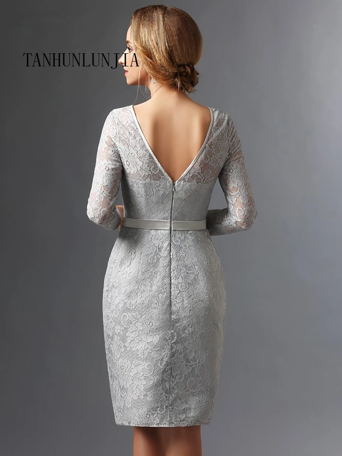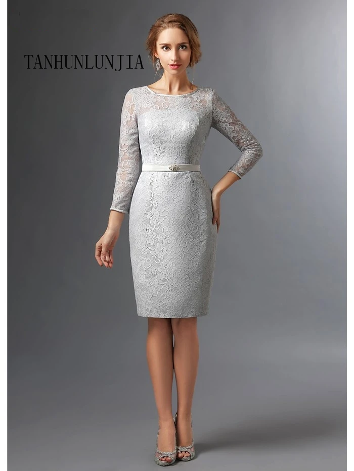 2021 Серебряные платья для матери невесты Оболочка 34 рукава Кружева по колено размера плюс; Короткие элегантные платья для мамы на свадьбу