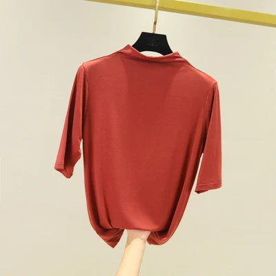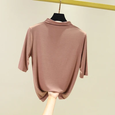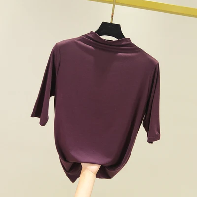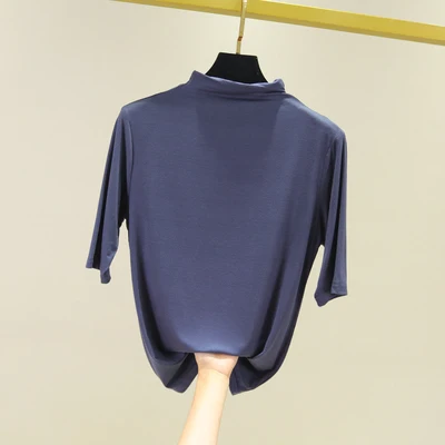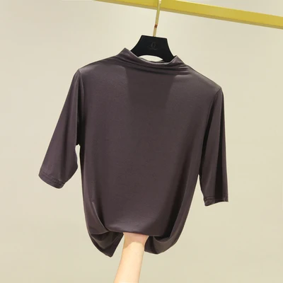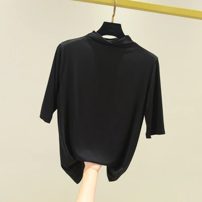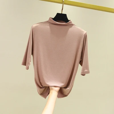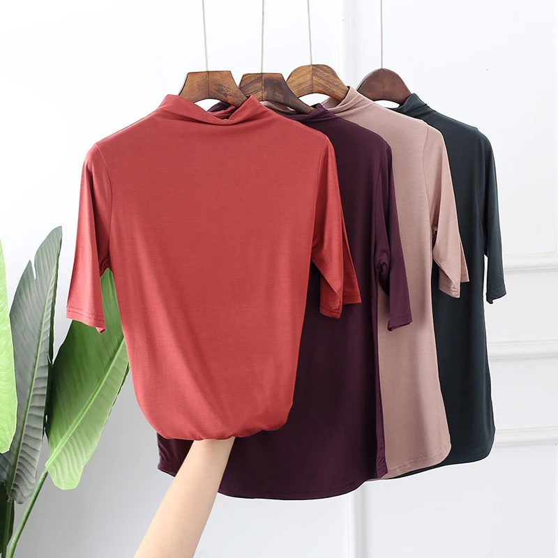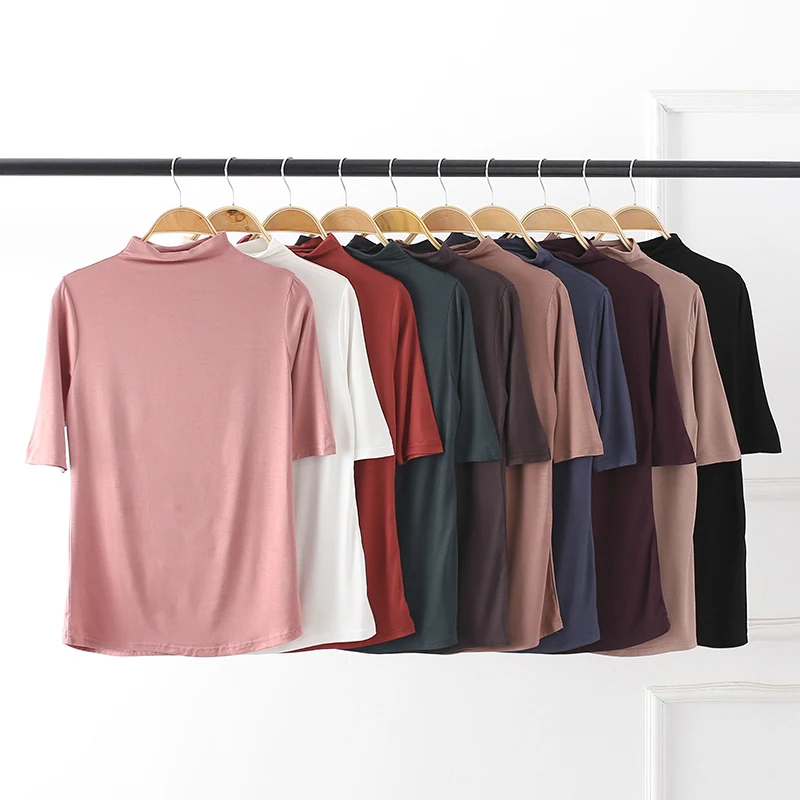 Базовая эластичная женская футболка, базовая облегающая футболка из 2021 хлопка с высоким воротником и рукавом до локтя