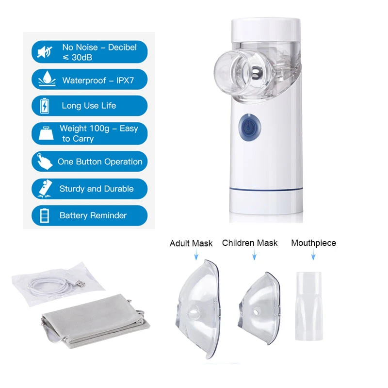 В комплект входит:1 * распылитель1 * маска для взрослых1 * детская маска для лица1 * мундштук1 * USB кабель для зарядки1 * Руководство1 * сумка для хранения