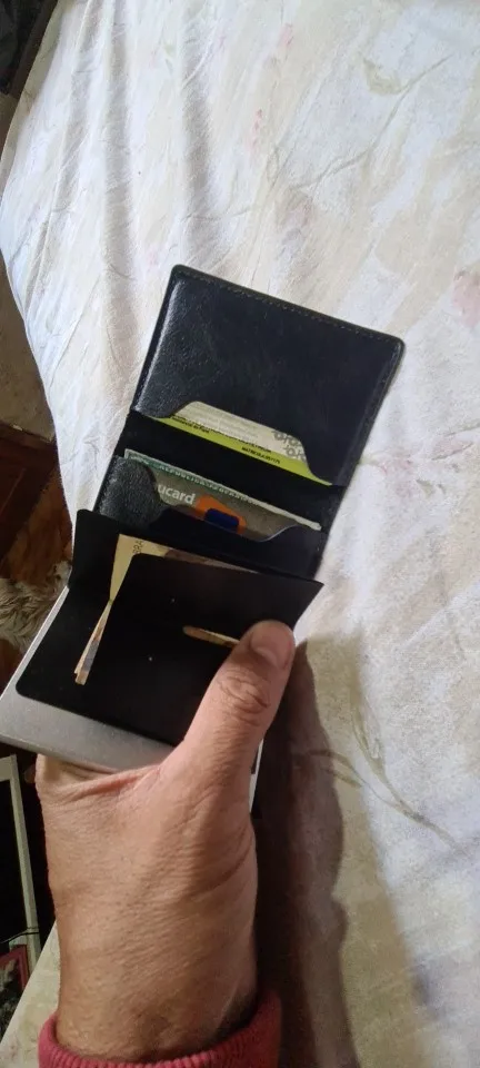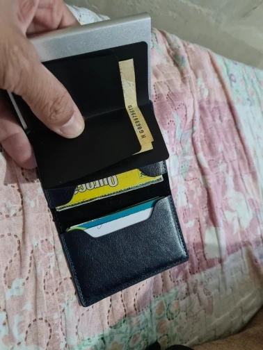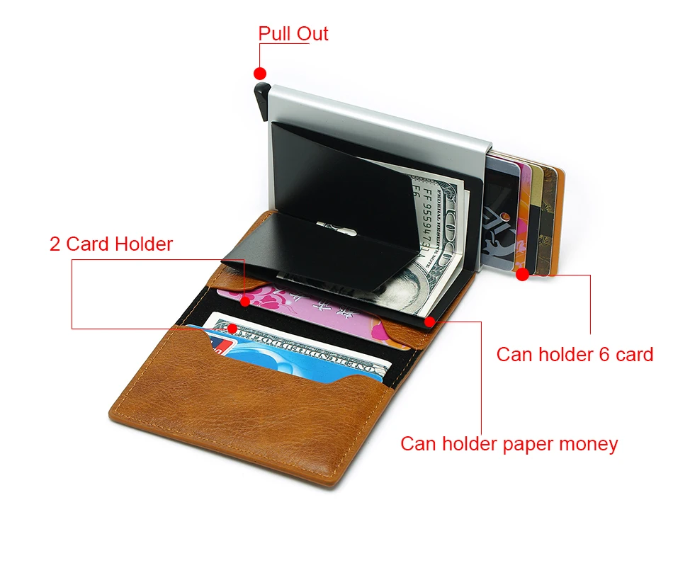 Характеристики:Размер: 95*65*15 ммЦвет: черный, коричневый, красный, серый, синийТип: металлический кредитный держатель для карт, автоматический кредитный держатель для картМатериал: алюминий + из искусственной кожиПосылка:1 * держатель для карт кошелек