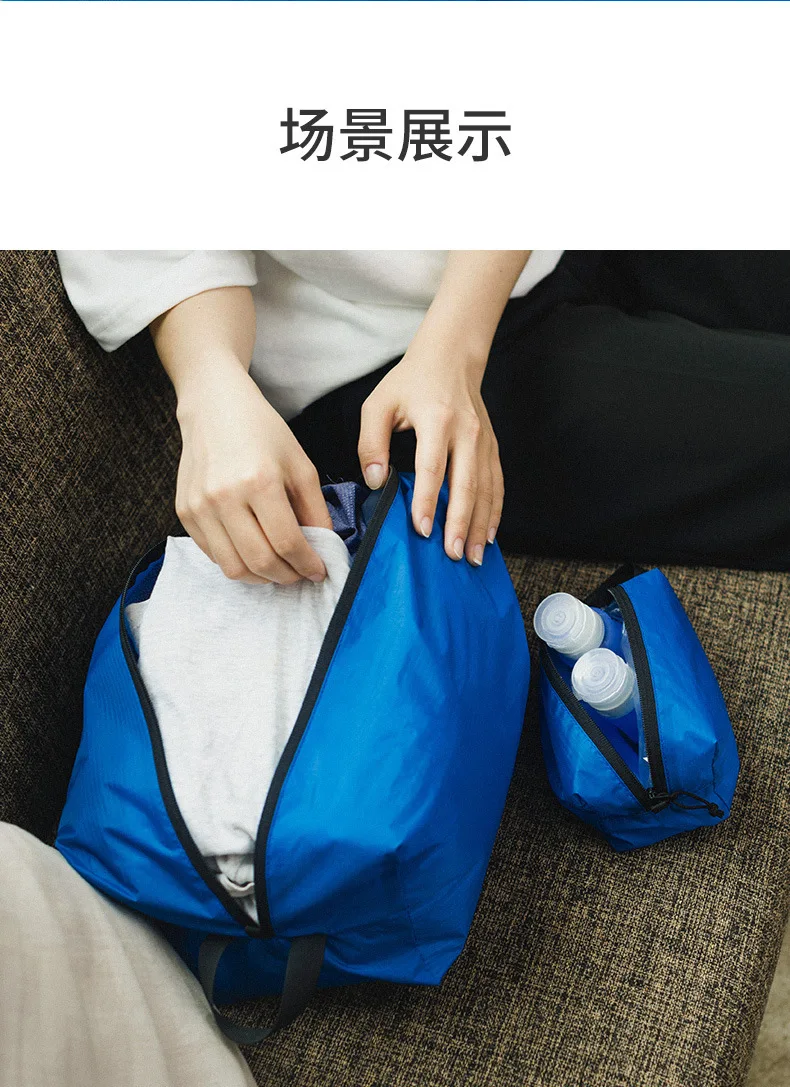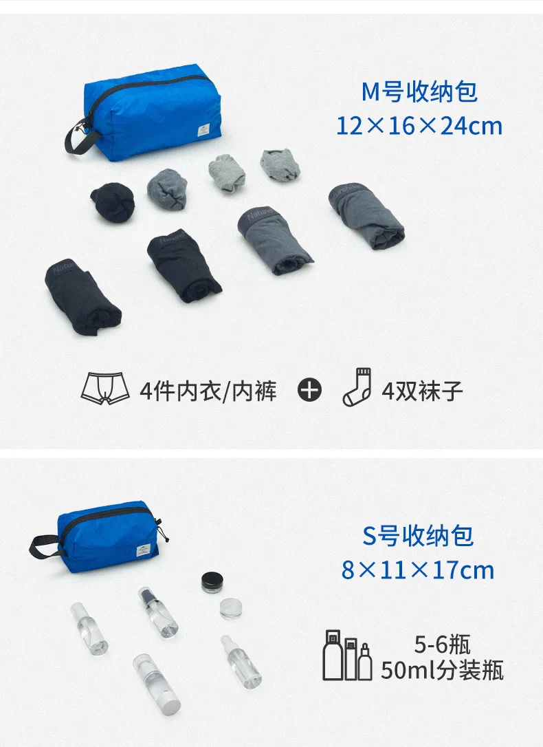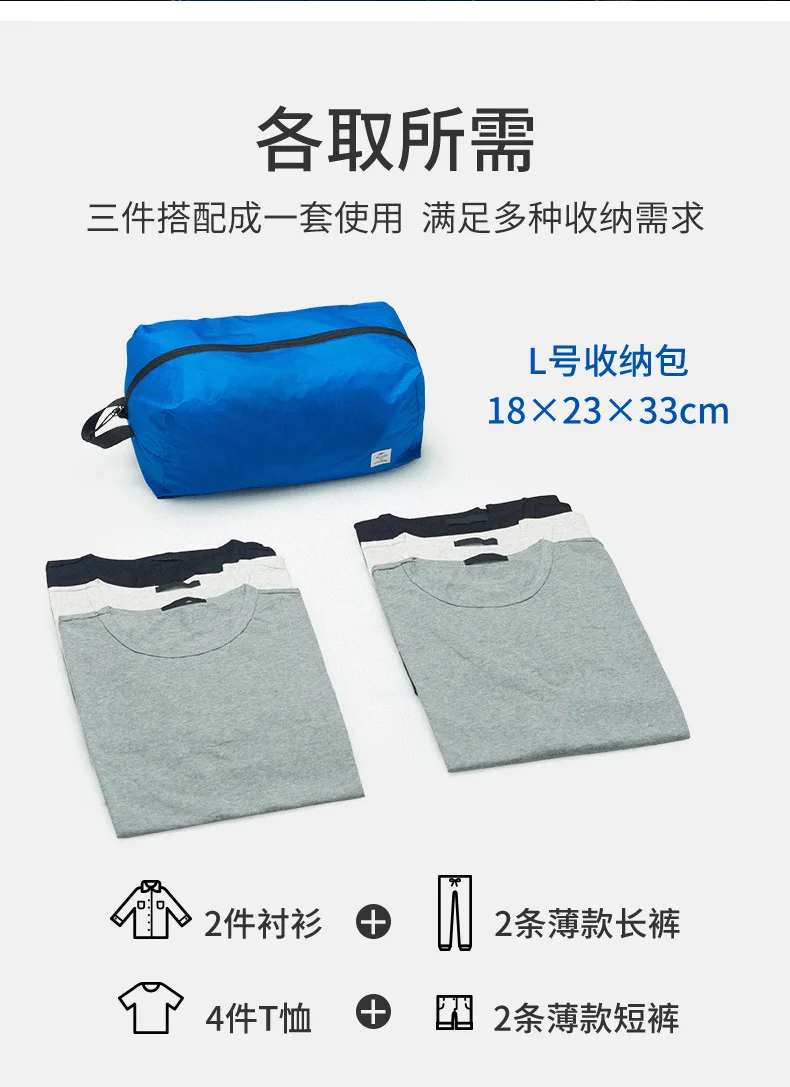 в большой чехол - обувь, во второй и мелкий чехол - одежду, носки, трусы, грязное бельё. занимает места минимум, и изнутри такая прикольная ткань, как будто покрытие, чтобы не намокло