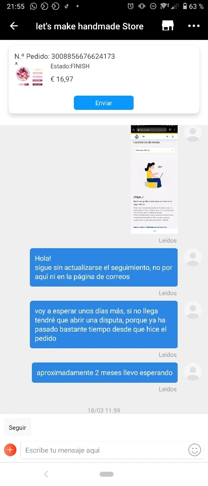 Nunca enviaron el pedido, alegaron problemas logísticos. Pusieron un número de seguimiento y me enviaron otro, sale como entregado y por ello por medio de Aliexpress no puedo pedir la devolución porque dice que ya me ha llegado, he adjuntado conversación con el vendedor donde dice que no lo ha enviado y ni aún así me devuelven el dinero.