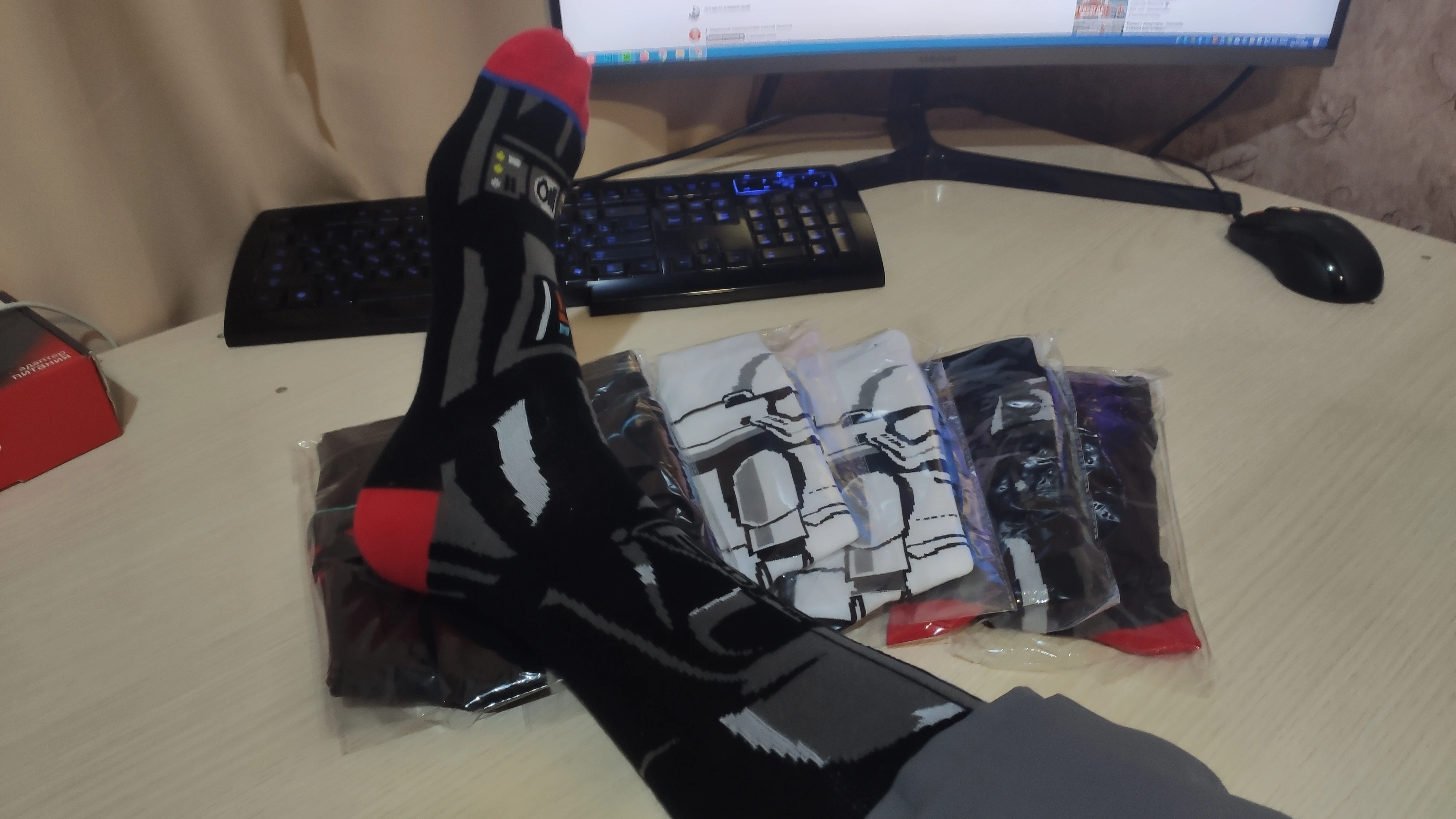 Ну что сказать. С момента оплаты заказа до получения в мое отделение почты прошел месяц. К чести продавца - отправил быстро, на таможне задержка была. Сами носки прикольные, ожидаемого качества за свои деньги. Это не уютная ХБшечка, и по ощущениям до первой дырки их можно будет носить аж несколько раз, но за такую сумму, да еще с принтами - я доволен. З.Ы. На 44 размере сидят прям внатяжечку, если нога больше - то стоит задуматься, если меньше - то проблем быть не должно